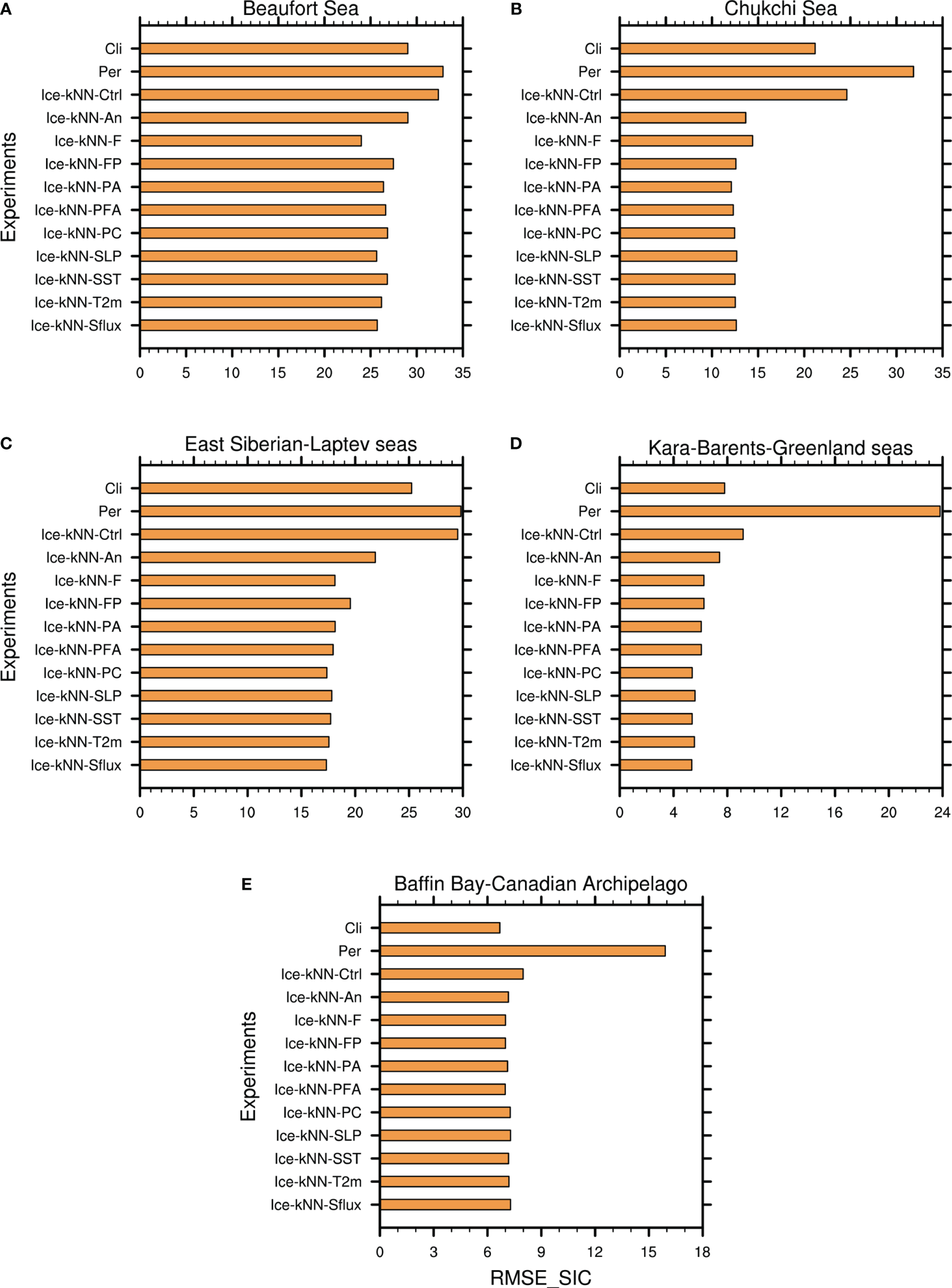 Spatial averaged RMSE_SIC of the Ice-kNN model in hindcasting September SIC averaged from 2011 to 2020 in the (A) Beaufort Sea, (B) Chukchi Sea, (C) East Siberian–Laptev seas, (D) Kara–Barents-Greenland seas, and (E) Baffin Bay–Canadian Archipelago.