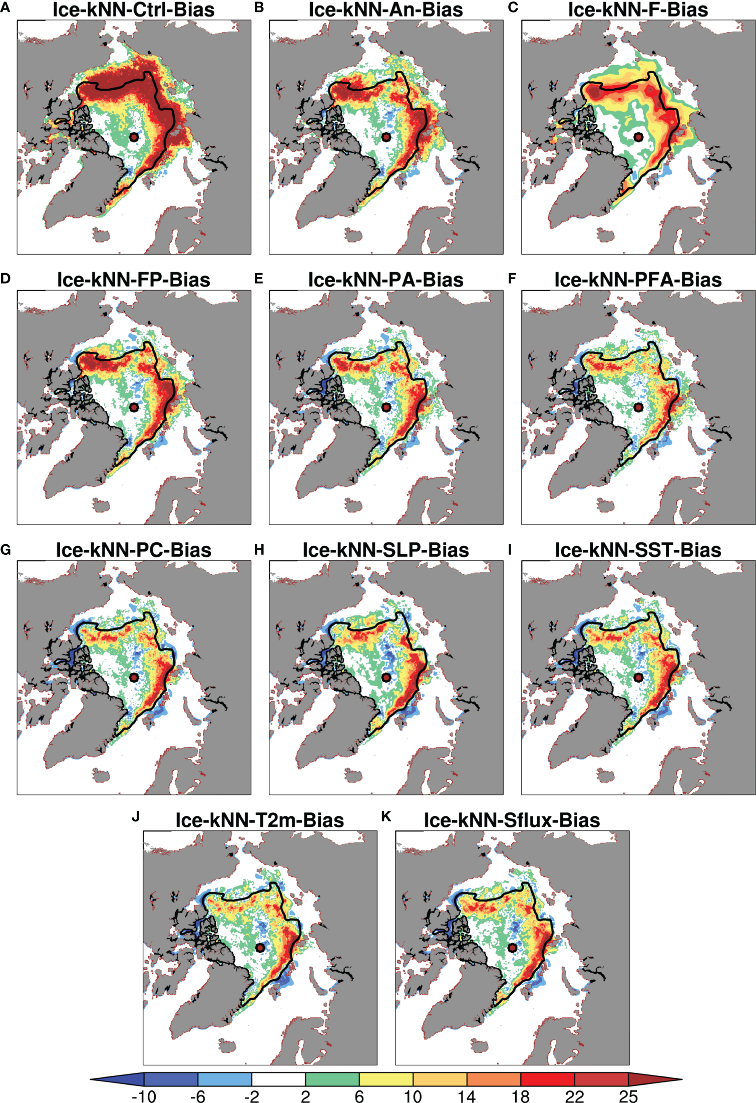 The prediction bias between the Ice-kNN model and the observation of (A) Ice-kNN-Ctrl-Bias, (B) Ice-kNN-An-Bias, (C) Ice-kNN-F-Bias, (D) Ice-kNN-FP-Bias, (E) Ice-kNN-PA-Bias, (F) Ice-kNN-PFA-Bias, (G) Ice-kNN-PC-Bias, (H) Ice-kNN-SLP-Bias, (I) Ice-kNN-SST-Bias, (J) Ice-kNN-T2m-Bias, and (K) Ice-kNN-Sflux-Bias in September averaged from 2011 to 2020. The black line represents the outline of the 10-year (2011-2020) mean extent for the September.