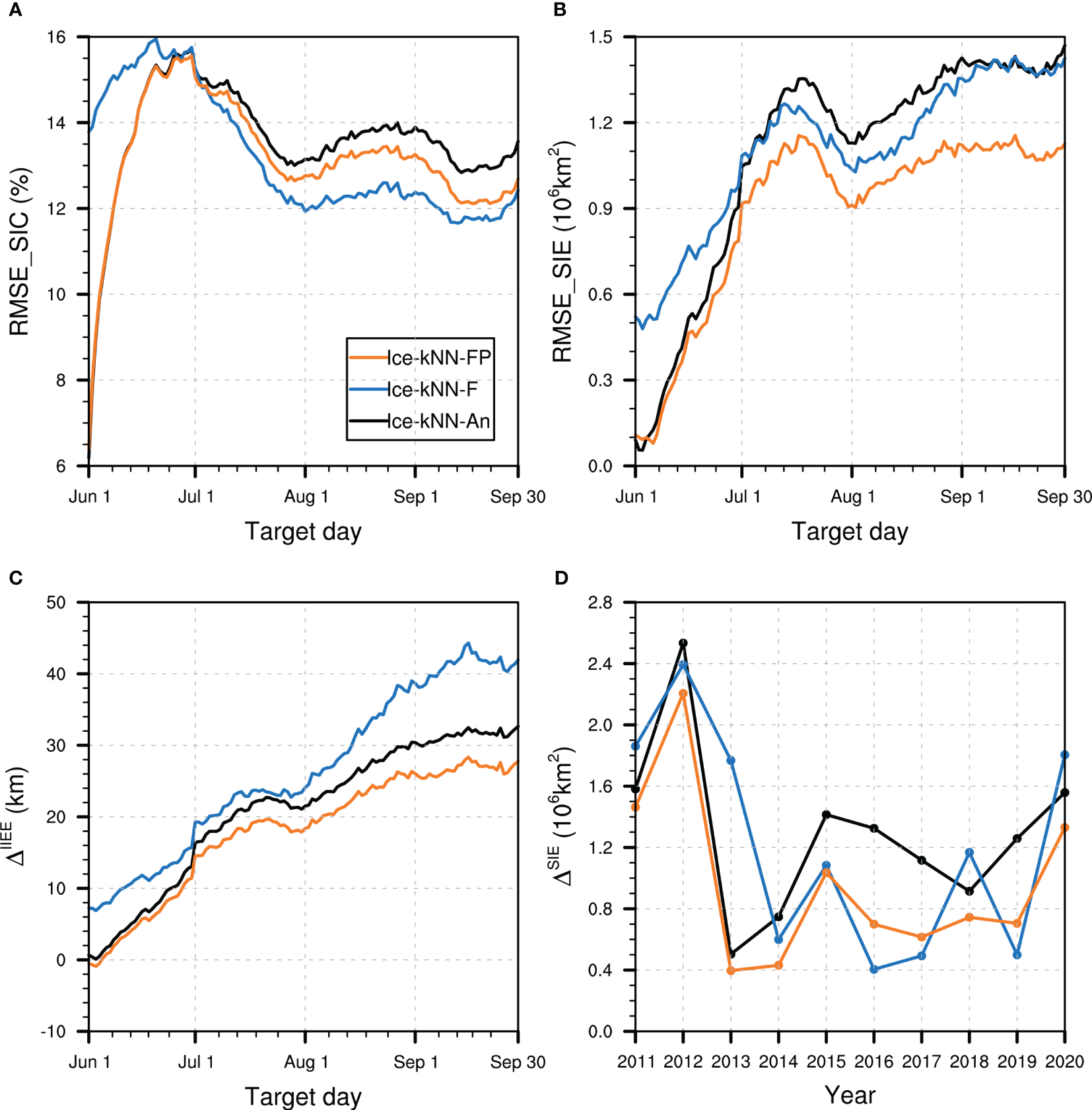 Hindcast skill comparison between Ice-kNN-An (black), Ice-kNN-F (blue), and Ice-kNN-FP (orange) measured by (A) spatial averaged RMSE_SIC, (B) RMSE_SIE, (C) ΔIIEE, and (D) ΔSIE.