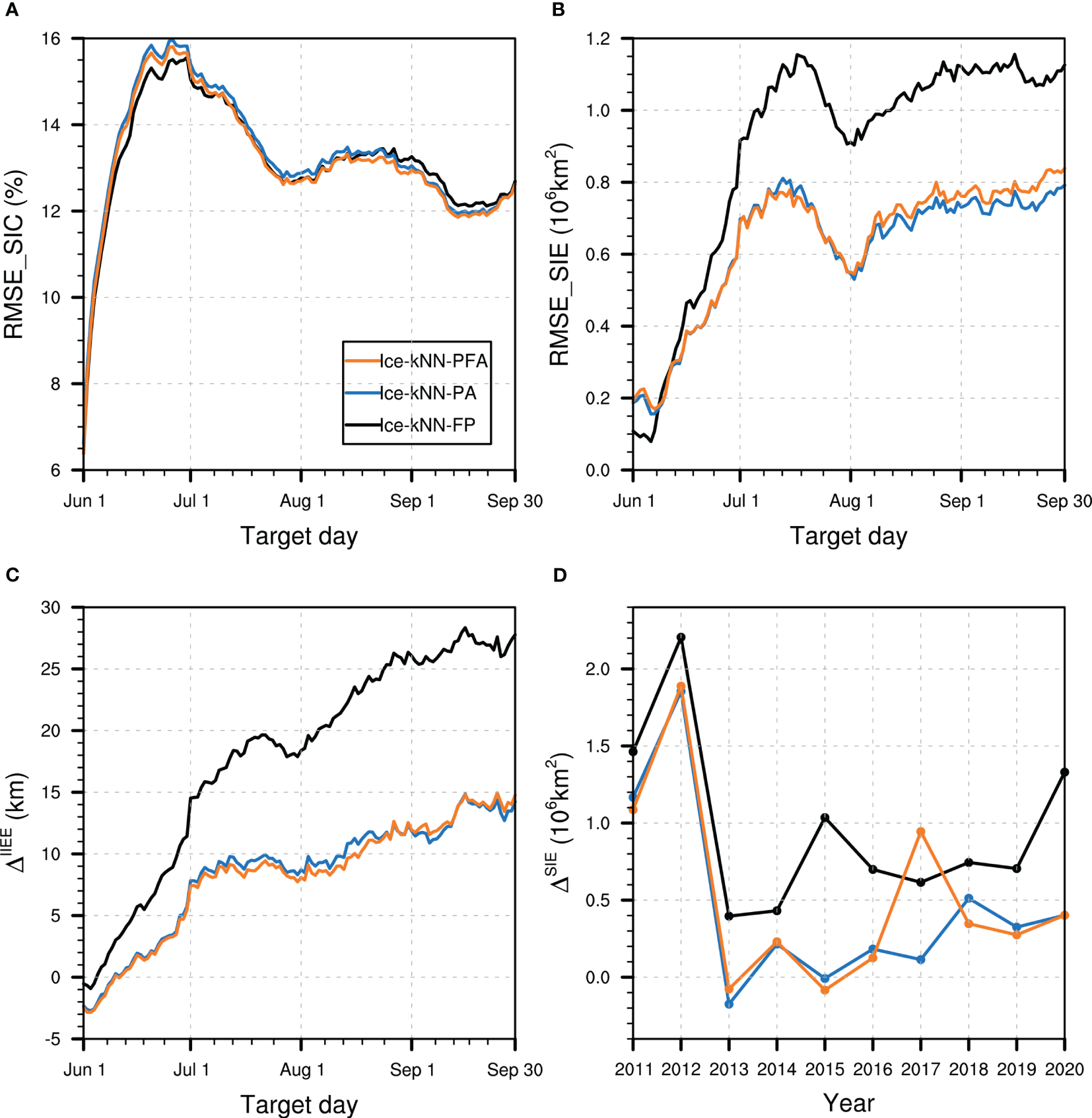 Hindcast skill comparison between Ice-kNN-FP (black), Ice-kNN-PA (blue), and Ice-kNN-PFA (orange) measured by (A) spatial averaged RMSE_SIC, (B) RMSE_SIE, (C) ΔIIEE, and (D) ΔSIE.