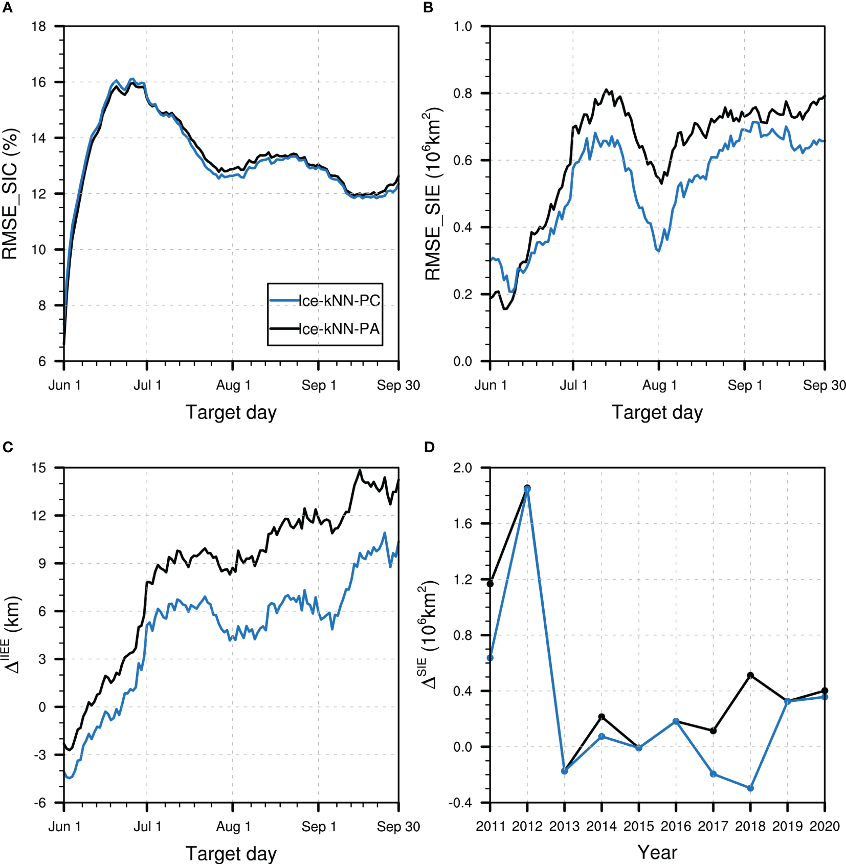 Hindcast skill comparison between Ice-kNN-PA (black) and Ice-kNN-PC (blue) measured by (A) spatial averaged RMSE_SIC, (B) RMSE_SIE, (C) ΔIIEE, and (D) ΔSIE.