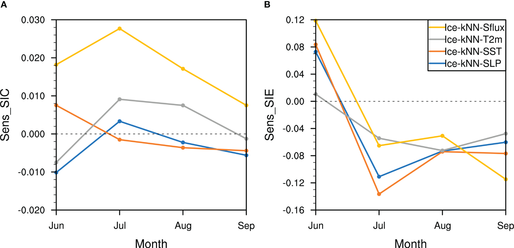 Sensitivity tests were conducted with the Ice-kNN model using SIC along with one extra variable as a predictor variable (Jun Kim et al., 2020; Liu et al., 2021). To examine the contribution of each predictor to the predictive skill of SIC, the sensitivity is defined as Sens_SIC; to examine the contribution to the predictive skill of SIE, the sensitivity is defined as Sens_SIE. The sensitivity formulas are as follows: