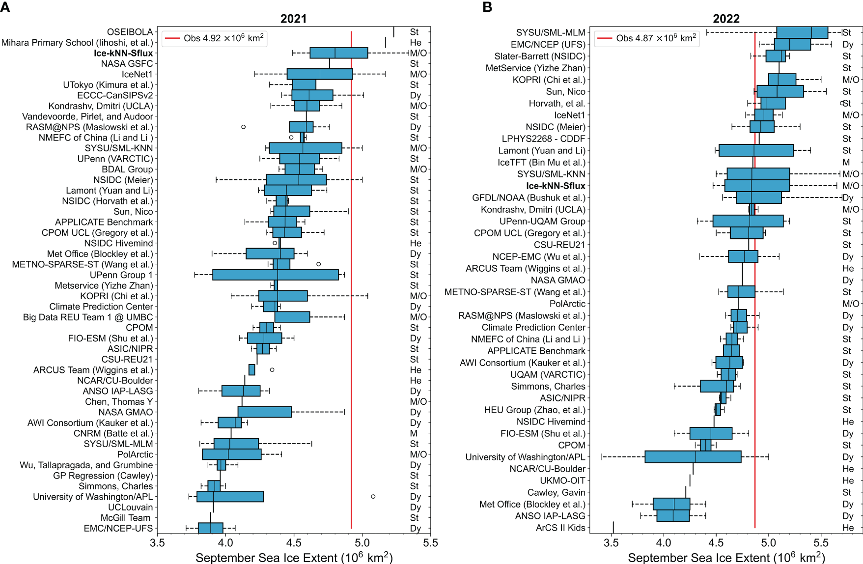 The Sea Ice Prediction Network (SIPN) is an open platform that has been collecting predictions of Arctic SIE in September around the world since 2008, then compiling and presenting them to those interested in Arctic sea ice. September SIE predictions have been submitted to the SIPN in June, July, and August since 2008, with an additional September submission added in 2021. There are a variety of prediction methods, including heuristic, statistical, mixed, dynamic, and machine learning/other. To further evaluate the Arctic sea ice forecast skill of Ice-kNN model, we compared the Arctic September SIEs in 2021 and 2022 using the Ice-kNN-Sflux model with the observations and the contributions for the September SIE predictions to the Post-Season Sea Ice Outlook for 2021 and 2022 (Bhatt et al., 2022a; Bhatt et al., 2022b). We utilized the SIC of May 31, June 30, July 31 and August 31 respectively as the input of Ice-kNN-Sflux model to predict the September SIEs. It should be noted here we use a hindcast (not real-time forecast) result of the Ice-kNN-Sflux model.