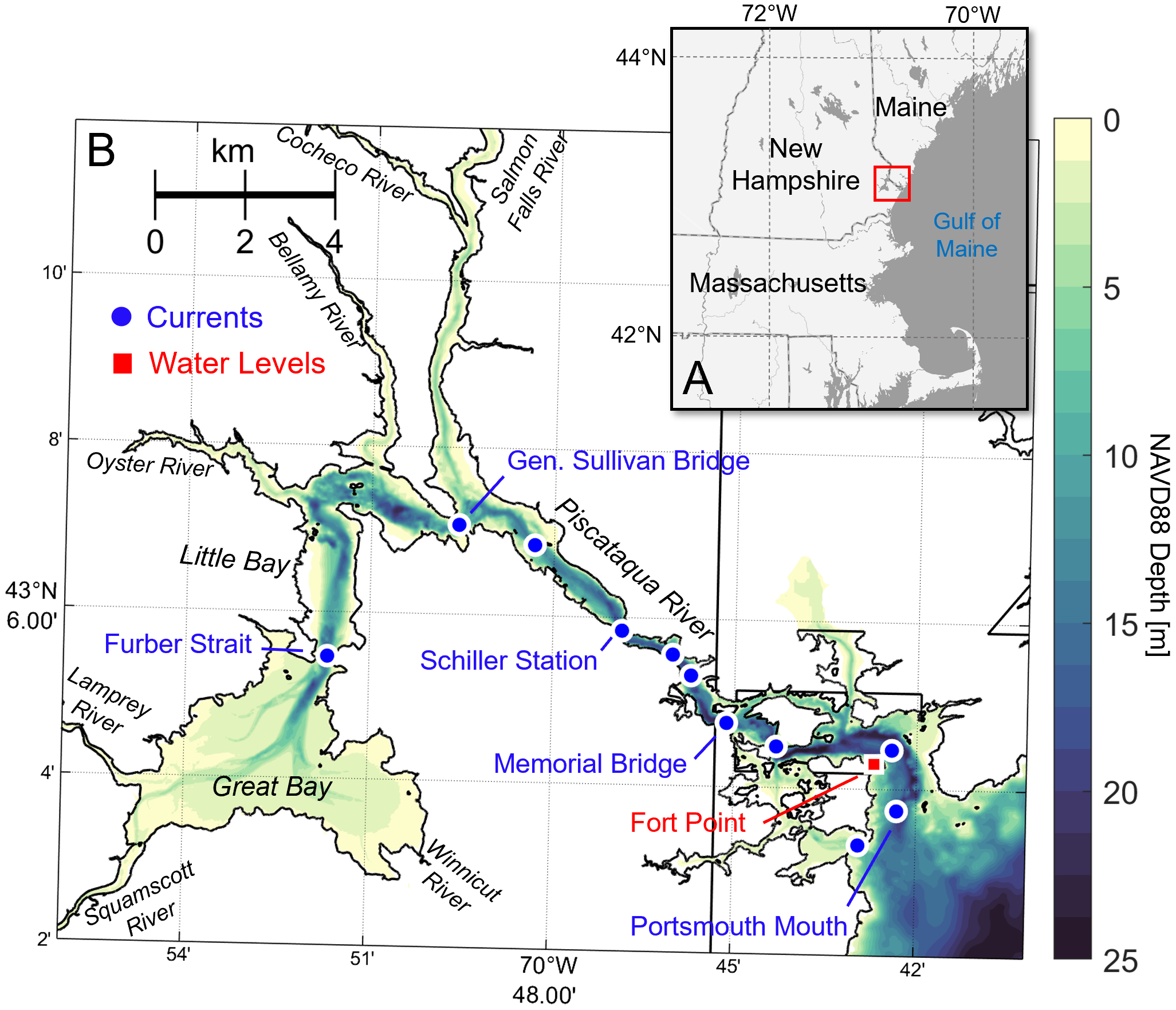 The PRBG estuary is a low freshwater inflow, mesotidal estuary located on the Maine – New Hampshire state line in the New England region of the United States (Figure 1A). The estuarine system is comprised of the tidal Piscataqua River which connects the Gulf of Maine to Little Bay then Great Bay (Figure 1B). Tidal forcing from the Gulf of Maine is dominated by the M2 astronomical constituent (semidiurnal) and fortnightly water level fluctuations in the estuary range from 2 to 4 m (Swift and Brown, 1983). The Great Bay portion of the system is a significant tidal flat region, and as much as 50% of the bay may be exposed at the lowest waters, allowing the estuary a significant intertidal storage capacity. The estuary’s average low water volume is m3 and high-water volume is m3, with a typical tidal prism of m3 (Swift and Brown, 1983). The large tidal range and estuary geometry allow depth-averaged tidal current velocities to exceed 2 m/s during both flood and ebb tides along most of the narrow, deep channels within the Piscataqua River proper. Freshwater is supplied to the system via seven streams: the Squamscott, Lamprey, Winnicut, Oyster, Bellamy, Cocheco, and Salmon Falls Rivers. The combined inflow from all seven tributaries is typically quite small, only contributing a freshwater volume up to 2% of the tidal prism, with infrequent exceptions during large rain events (Short, 1992). Strong tidal mixing and low freshwater inflow result in negligible vertical stratification (29 – 31 psu surface to bottom, typically) except in close proximity to river mouths, and very small horizontal variation in salinity from Great Bay (~31 psu) to the Gulf of Maine (~31.5 psu) in the absence of rainfall (Cook et al., 2019).