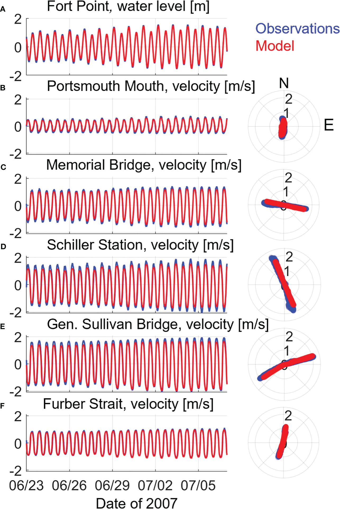 Time series of modeled (red) versus observed (blue) Fort Point water levels (A) and depth-averaged principal component current velocities (B–F). Velocity time series (left) are accompanied by scatter plots comparing velocity magnitude and direction in compass bearings (right) at the Portsmouth Mouth (B), Memorial Bridge (C), Schiller Station (D), General Sullivan Bridge (E), and Furber Strait (F) ADCP stations.