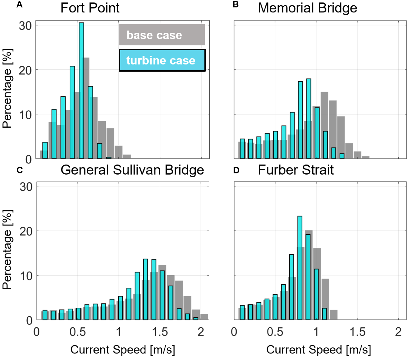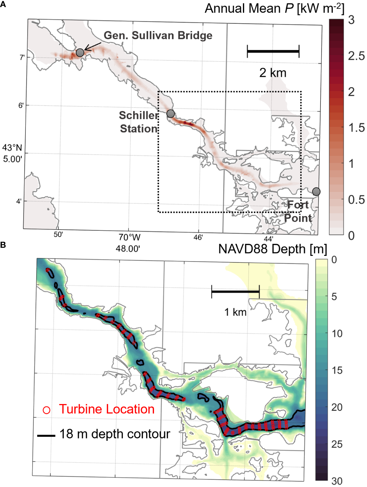 We next evaluated depths in the two high energy regions. Maximum depths in both regions are greater than 18 m in the center channel (Figure 1). Generally, the section nearer the mouth features larger swaths of >18 m depths, uniform across the entire channel, more favorable for multiple rows of multiple turbines. As such, we chose this region (Fort Point to Schiller Station) as the best site for a potential tidal turbine farm (Figure 4B). The region around General Sullivan bridge remains favorable for tidal energy extraction, but the shallower depths would limit turbine diameter further. In this study, we chose to limit our energy extraction scenario to the deeper region near the mouth. Future investigations will explore the differing influence of turbine array location on dynamics.