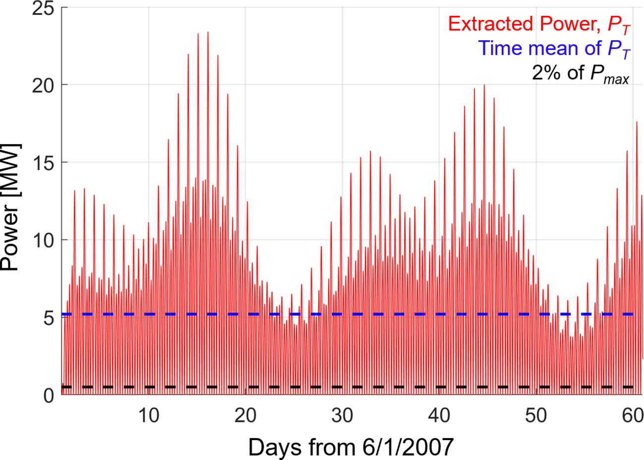 Time series of turbine extracted power, PT, in the PRGB estuary during a 2-month simulation in 2007 (red). The temporal average of PT and 2% of Pmax are shown as the dashed blue and black lines, respectively.