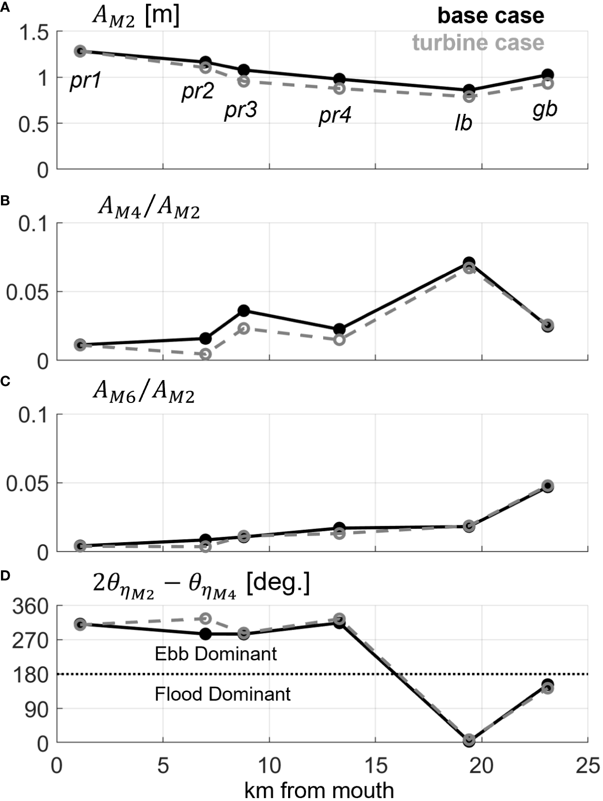 Idealized modeling of stratified estuaries indicates vertical stratification landward of turbine locations can decrease from enhanced mixing, leading to weakened baroclinic circulation and smaller flushing times (Yang and Wang, 2015). Decreased flushing times negatively impact water quality, while increased mixing can be helpful in sustaining healthy dissolved oxygen levels (Wang et al., 2015). In well-mixed systems, tidal turbines have been found to decrease flushing times (Yang et al., 2013), lead to local and system-wide modulation of tidal flow fields (Hasegawa et al., 2011; Ward et al., 2012), and change residual flow magnitudes and direction (e.g., Sánchez et al., 2014; Wang and Yang, 2017). Importantly, the hydrodynamic response of well-mixed systems can be asymmetrically modified by tidal turbines: i.e., currents and water levels over one phase of the tide are altered more than the other (Neill et al., 2009; Sánchez et al., 2014). Although former studies have identified changing tidal asymmetry induced by tidal turbines as a control on the residual flow field (Sánchez et al., 2014), it remains unclear exactly which of the nonlinear physical mechanisms controlling asymmetric distortion (e.g., friction, geometry) are being affected. Further, we do not know the spatial extent of a local tidal turbine array’s influence on nonlinear dynamics, tidal distortion, and transport. Considering barotropic tidal asymmetry is a major control on tidal and subtidal transport in many well-mixed estuaries, it becomes prudent to investigate the topic more thoroughly.