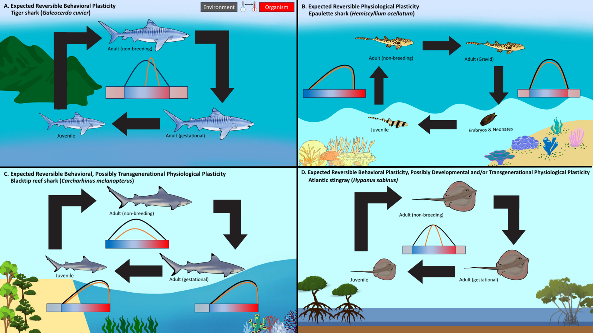 Expected pathways of phenotypic plasticity within four elasmobranch species [(A) Tiger Shark – Galeocerdo cuvier, (B) Epaulette shark – Hemiscyllium ocellatum, (C) Blacktip reef shark – Carcharhinus melanopterus, (D) Atlantic stingray – Hypanus sabinus across life history stages. The horizontal color gradient bar (i.e., blue and red) represents the thermal environmental variability that depends on the associated habitat. The black distribution curve indicates the frequency of environmental temperatures for each life stage. The orange distribution curve indicates the frequency of organismal body temperatures for each life stage, with a difference between the environment (i.e., black) indicating behavioral thermoregulation. (A)Galeocerdo cuvier represents a highly mobile, behavioral thermoregulation specialist that follows distinct temperature gradients around 22°C throughout its ontogeny to optimize performance within tropical and temperate waters. (B)Hemiscyllium ocellatum exhibits reversible physiological plasticity or tolerance, with non-breeding adults and juveniles encountering daily, drastic temperature fluctuations on the reef flats. Gravid adults presumably seek out more thermally stable, deeper waters to deposit their eggs within the reef structure, to conceal them from predators, and to protect them from the high temperatures present in the reef flat environments. (C)Carcharhinus melanopterus can utilize behavioral plasticity for much of their life; however, when females shift into shallow reef lagoons during gestational periods, they and their litter are exposed to highly variable temperatures. High site fidelity creates environmental homogeneity between parent and offspring that is conducive to TGP. (D)Hypanus sabinus elicits the capacity to behaviorally thermoregulate across life stages but also exhibits physiological tolerance to variable temperatures within inshore estuaries. Because this species shows both site fidelity and longer-range movements, there it also potential for both DP and TGP.