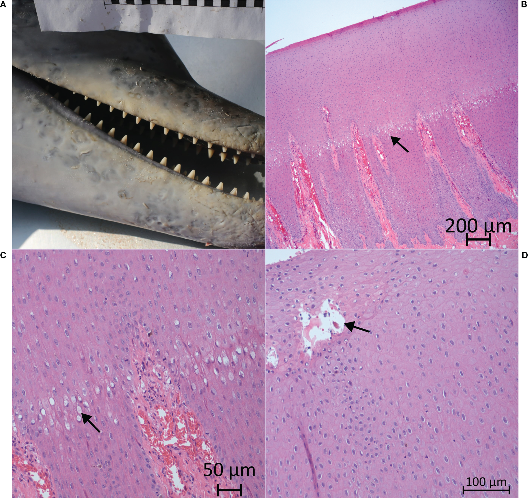 Various types of infectious diseases (e.g., viral, bacterial, fungal) present cutaneous manifestations in many cetacean species (Geraci et al., 1979; Schulman and Lipscomb, 1999; Murdoch et al., 2008; Rehtanz et al., 2012; Townsend and Staggs, 2020). The mechanisms of these diseases and pathogen tissue tropism result in distinct lesion patterns. Identifying patterns could help differentiate between disease types and streamline diagnostics and pathogen identification. For example, dolphin poxviruses present as various forms of light to dark gray and black (hyperpigmented) skin lesions on the head, dorsum, dorsal fin, pectoral flippers, and fluke. Early stages typically present as flat to slightly raised, round to elliptical, light gray pigmented lesions with dark gray margins (i.e., ring, circle), while advanced stages transition to punctate, hyperpigmented, depressed, pitted centers (i.e., pinhole; Townsend and Staggs, 2020). Aggregation of pitted, punctate foci or the confluence of round to elliptical foci are thought to result in the formation of the tattoo lesion pattern. However, it has been theorized that the varied pattern presentation for dolphin poxvirus could reflect differences between viral strains. Irrespective of poxvirus pattern presentation, it is considered a biomarker of cetacean and habitat health, as stress is believed to influence the external manifestation of this disease (Geraci et al., 1979; Van Bressem et al., 2009b; Segura-Göthlin et al., 2021). Other infectious diseases, such as herpesviruses, papillomaviruses, Erysipelothrix rhusiopathiae, and Paracoccidioides cetii (phylogenetically distinguished from Lacazia loboi), are all documented through the manifestation of skin lesions, wherein similar lesion patterns are highlighted (Schulman and Lipscomb, 1999; Blanchard et al., 2001; Bossart et al., 2003; Reif et al., 2006; Smolarek Benson et al., 2006; Durden et al., 2009; van Elk et al., 2009; Murdoch et al., 2010; Daura-Jorge and Simões-Lopes, 2011; Hart et al., 2011; Laporta et al., 2016; Vilela et al., 2016; Ramos et al., 2018; Vilela et al., 2021).