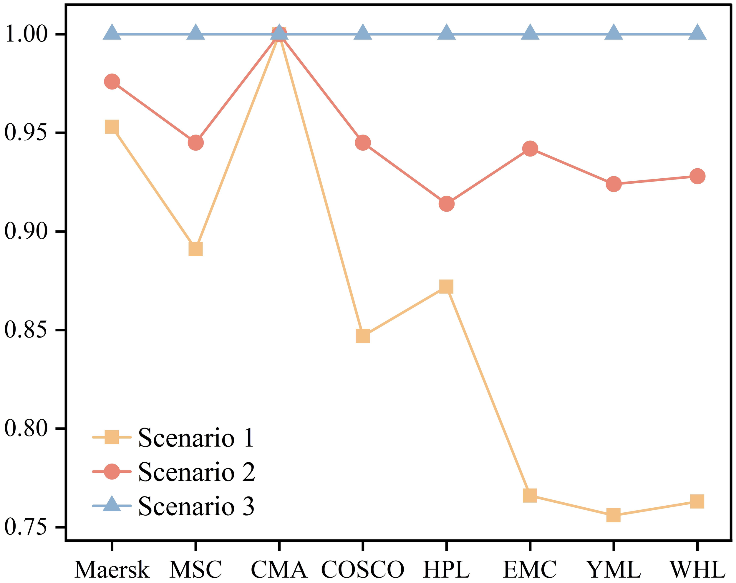 Firstly, the initial quota allocation results of companies in all cases are relatively close, and the average allocation efficiency of carbon emission quotas in scenario 3 is slightly higher. It shows that there is no significant difference between the historical method, the baseline method and the mixed method in terms of the efficiency of carbon emission quota allocation. The mixed method has a slightly higher efficiency. Secondly, the efficiency of scenario 3 is slightly higher. This scenario includes considering companies’ past carbon emission behavior, industry standards and rewarding those companies with excellent performance in emission reduction. These are the main factors affecting the allocation of carbon emission allowances. Meanwhile,these are the key factors affecting the realization of carbon emission reduction targets in the shipping industry. Finally, the allocation of carbon emission allowances under each scenario has not reached the Pareto optimal state, which indicates that there is still room for improvement in these eight companies. The efficiency of CMA in scenario 1 and scenario 3 is 1, indicating that the company’s allocation results are effective. Adjust the number of carbon emission allowances according to equation (7) until the allocation efficiency of all companies is 1. There is no further room for adjustment to reach a Pareto optimal state.
