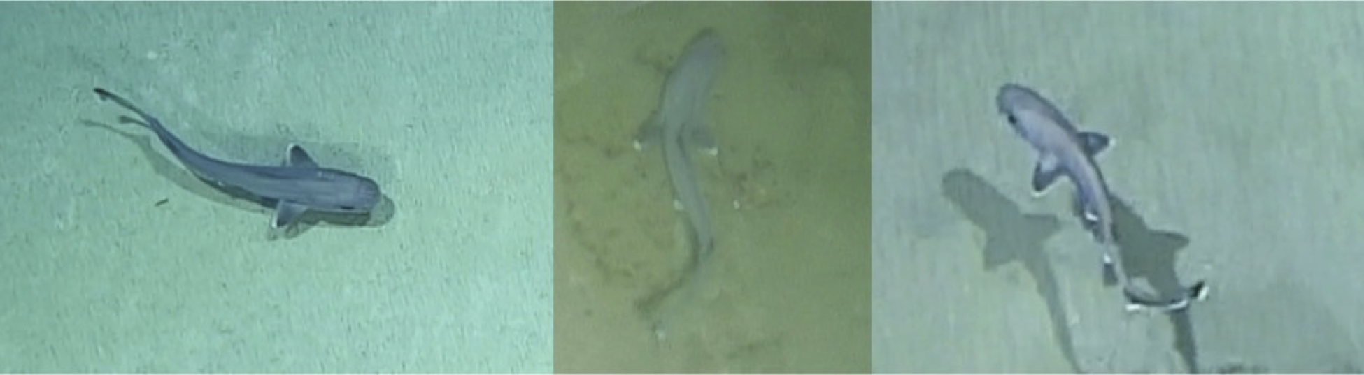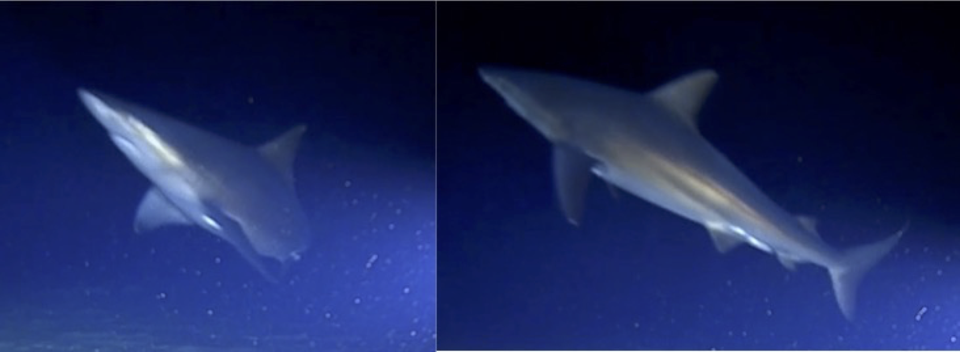 The bignose shark, C. altimus, has previously been recorded at a maximum depth of 810 m in Northern Australia (Stevens, 1991). During the RSDE we recorded this species at 886 m, extending the known depth record. C.altimus has been described as a deep-benthic shark (Compagno, 2001; Smith and Heemstra, 1986), possibly undergoing diel vertical migrations rising toward the surface at night, following prey on related biomass movements (Brierley, 2014; Behrenfeld et al., 2019). Reliable data on the specific depth range of this species or its effective distribution is scarce, often due to misidentification with other related species of the Family Carcharhinidae, like the Sandbar shark (C. plumbeus) or the Dusky shark (C. obscuros) (Duffy and Struthers, 2017; Ayas et al., 2020). This can possibly be ascribed to the almost neutral features this species possesses, preventing an easy morphological identification, particularly given many observations are fleeting. Accurate identification of C. altimus individuals remains troublesome, even though some characters can be used for identification, such as the position and size of the fins. Moreover, it is difficult to have a confident basis for their identification in the absence of accurate images of these animals in their natural environment. In our study, the correct species was identified based on distinctive characteristics observed. These include a heavy cylindrical body shape, a large and elongated snout with long nasal flaps, a prominent interdorsal ridge. The pectoral and dorsal fins are large and straight. The first dorsal fin begins in the middle of the pectoral fin and exhibits an angular or slightly rounded apex. These peculiar traits allowed for accurate species identification (Compagno et al., 1989; Grace, 2001; Serena, 2005).