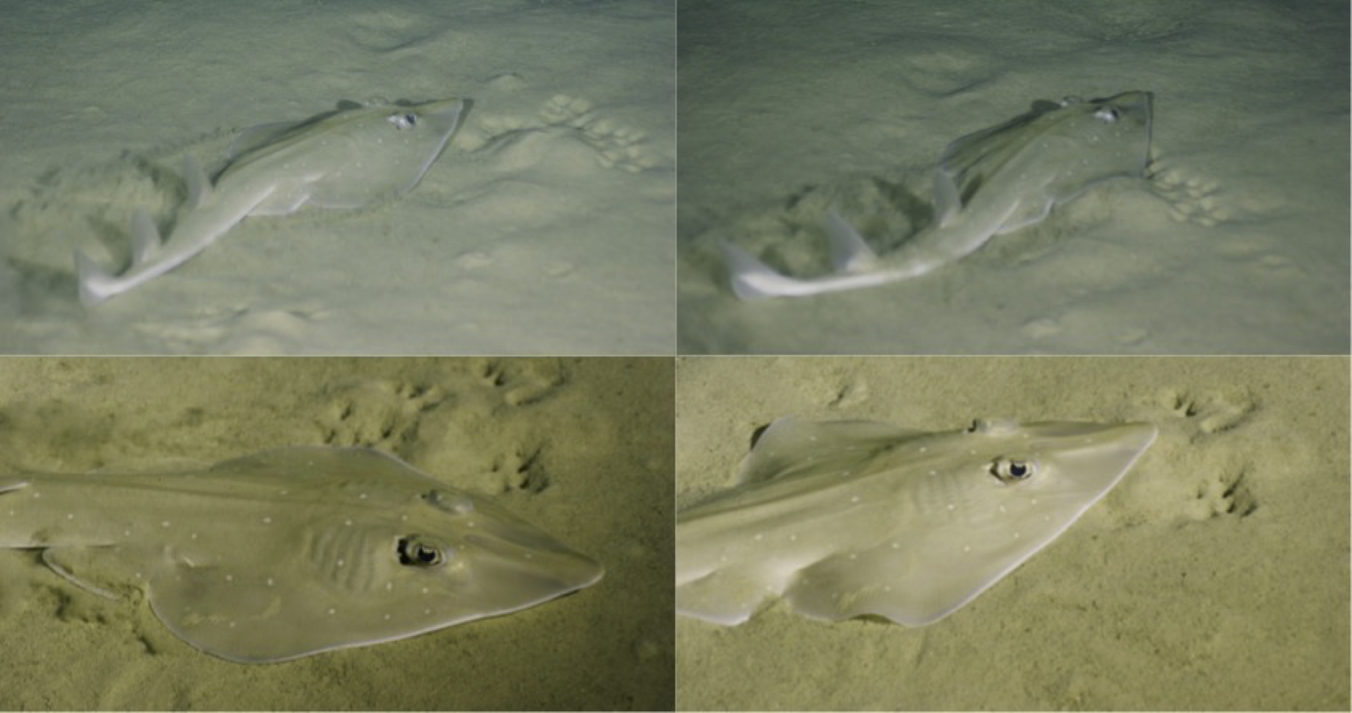 Imagery of an adult R. punctifer individual captured during a submersible dive on 10th October 2020, at a depth of 486 m. The characteristics white spots on the dorsal surface of the body, together with the body shape and position of the fins, are clear identification features.
