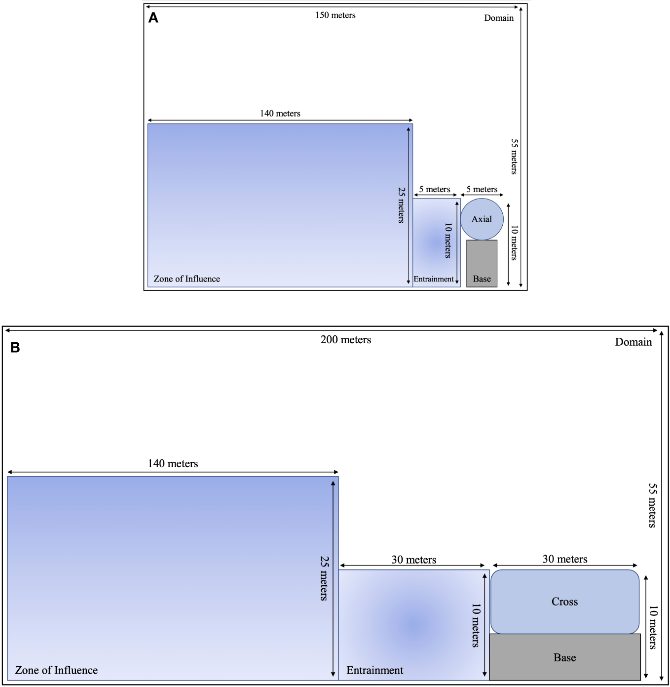 Entrainment occurs when a fish is within the area adjacent to the device, normal to the device face. If an animal continues its current trajectory with no avoidance, it will collide with the turbine base or enter the turbine. The turbine base and entry area are half the vertical height of the turbine (Figures 2A, B). Areal dimensions of the cross-flow turbine base and turbine entrance are both 30 m by 10 m. Areal dimensions of the axial-flow turbine base and turbine entrance are 5 m by 10 m. The probability of entrainment is defined as the probability of a fish being within the zone of influence multiplied by the probability of 1 minus avoiding the device given that the individual is within the zone of influence (Table 1). Avoidance calculations are detailed below.