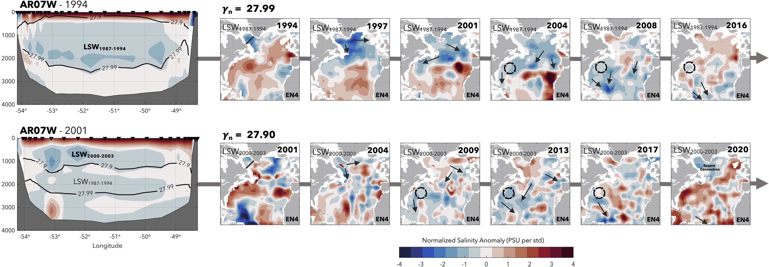 Spreading pathways of LSW1987-1994 (top, γn = 27.99) and LSW2000-2003 (bottom, γn = 27.90) from the Labrador Sea to Subtropics (10°N) as shown through normalized EN4 salinity anomalies along the respective neutral density planes for each class. Cross-sections of normalized salinity anomalies through the Labrador Sea (AR07W hydrographic line) highlight the anomalously-fresh signal of both water masses in depth space, with the γn = 27.90 and γn = 27.99 isopycnals indicated by the contours. The propagation of the anomalously-fresh convective signal for each class is represented by the arrows in the annual isopycnal planes.