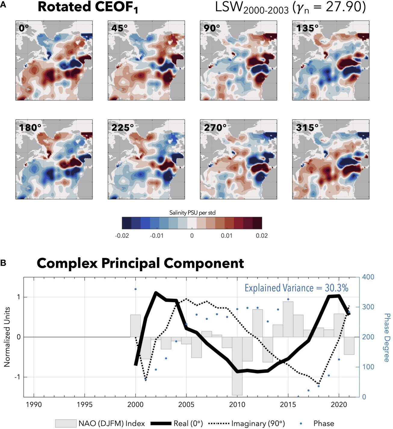 (A) Reconstruction of the first complex EOF (CEOF1) mode of the annual normalized salinity anomalies along the γn = 27.90 isopycnal plane representing LSW2000-2003 at 45° phase intervals with (B) the real and imaginary parts of the first complex principal component (CPC1) showing the time evolution along the plane. The angle of rotation is shown in the top left corner of each panel. Positive CPC1 indicates freshening over the blue-colored areas and salinification over the red-colored areas. The CEOF1 of γn = 27.90 reflects years 2000-2021 to eliminate the biasing of the LSW1987-1994 convective imprint on this isopycnal plane. Temporal phase is plotted 0-360° alongside the CPC1 shown as the blue dots. Normalized NAO indices are compared to the CPC1; a cross correlation of the December-March (DJFM) NAO index with the CPC1 also shows a lag of 4 years with a significant maximum correlation of 0.7.