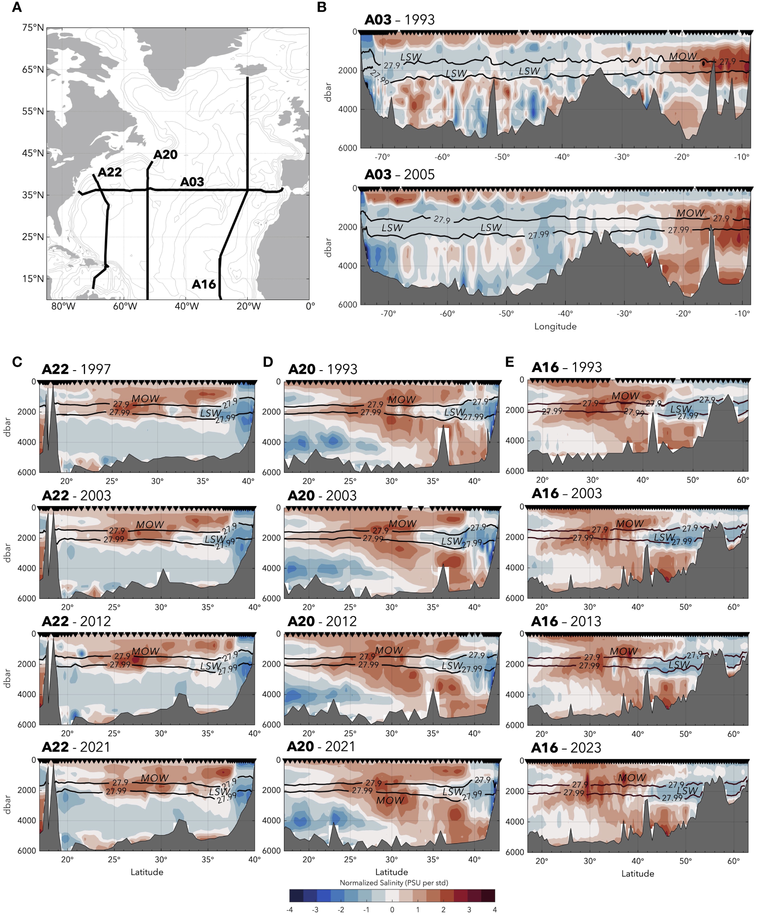 Normalized salinity anomalies of the zonal GO-SHIP (B) A03 and meridional (C) A22, (D) A20, and (E) A16 hydrographic sections in the North Atlantic domain (A). Cross-sections highlight the anomalously-fresh interior plume of LSW in depth space extending zonally from the western boundary to 40°W, and meridionally from the western boundary to 35°N (A20) and in some cases 32°N (A22), covering nearly the entire western half of the Atlantic basin. The southward protrusion of LSW from the eastern subpolar region to the eastern Atlantic extends to 40°N along the A16 transects. The characteristic γn = 27.90 and γn = 27.99 neutral density isopycnals are indicated by the contours. Labrador Sea Water (LSW) and Mediterranean Overflow Water (MOW) masses are labeled for reference.