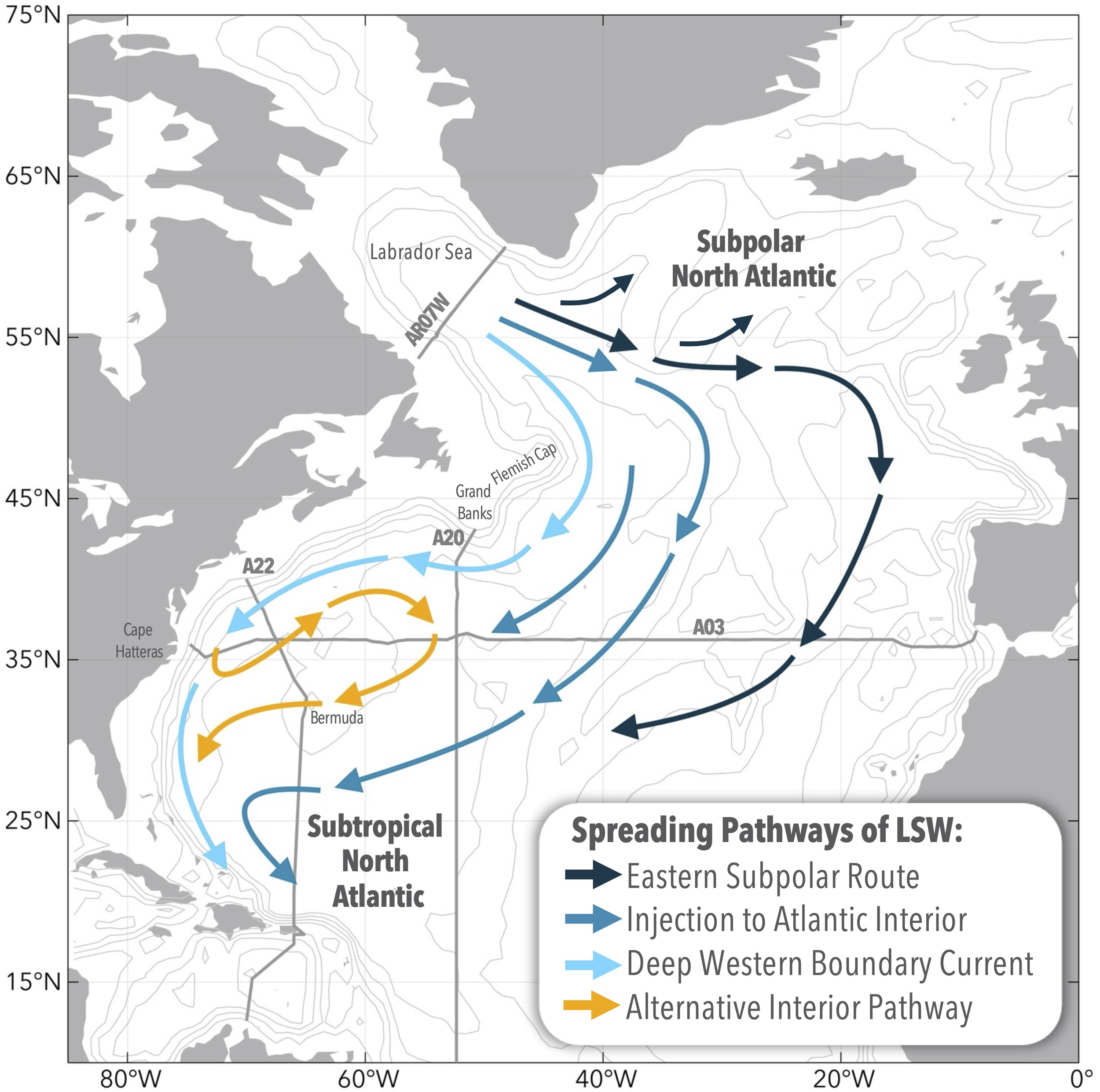 Summary sketch of the inferred and observed LSW advective pathways spatially and discretely observed using the EN4 gridded profiles, the AR07W, A03, A16, A20, and A22 GO-SHIP hydrographic lines shown on the map, CEOF propagation pathways, and the adjusted geostrophic velocity fields. The observations help to confirm evidence of an alternative interior advective pathway of LSW branching off the DWBC at 36°N, as well as showcase both the importance and prominence of interior export pathways. Bathymetric contours are shown in 1000 m intervals.