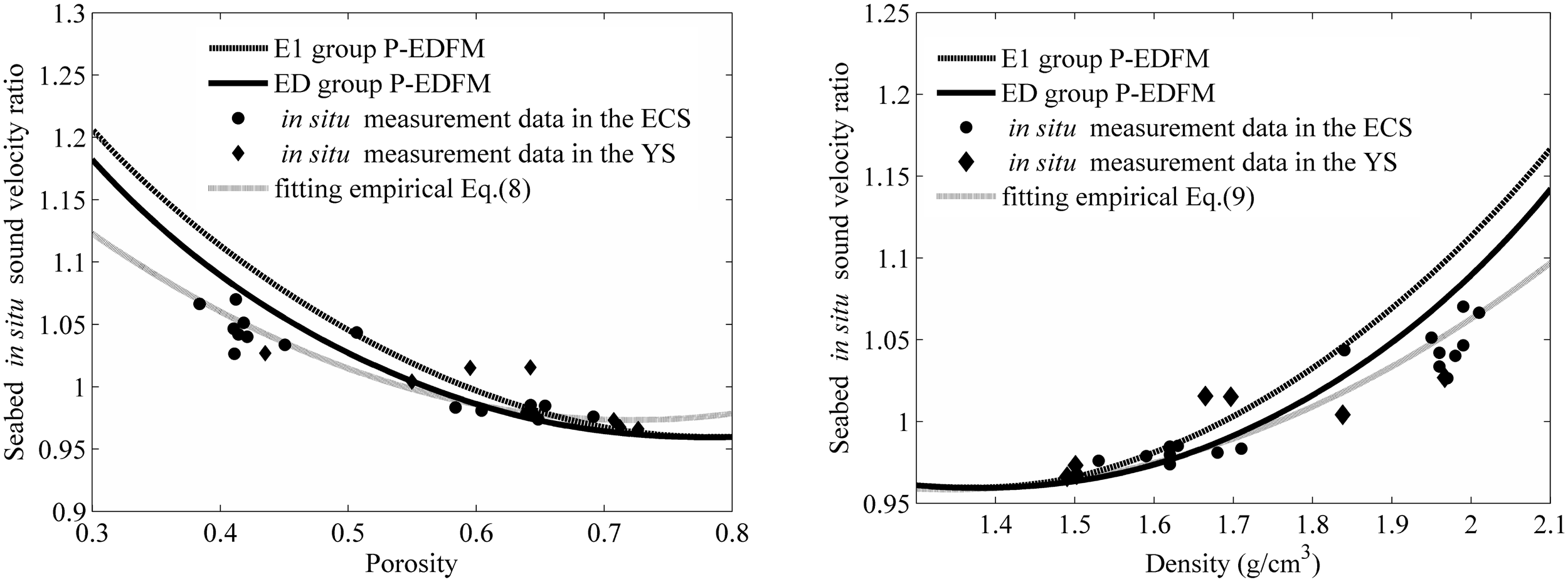 (1) The sound velocity ratio of seafloor sediments and bottom seawater measured in situ in the ECS and YS exhibits decreases with increasing porosity and with decreasing density. This characteristic can be well explained by P-EDFM.