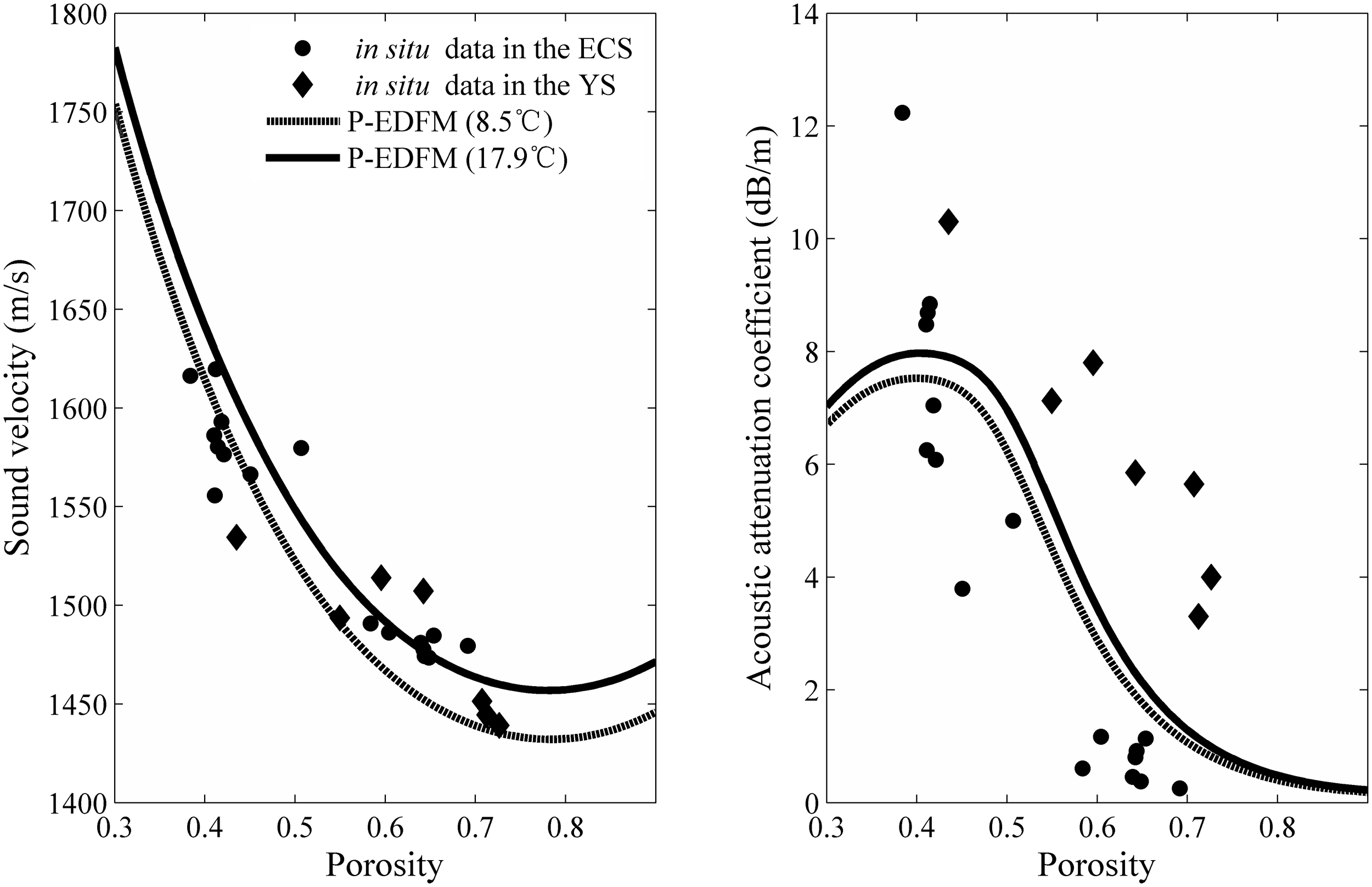 In the in situ acoustic measurements conducted in the YS and ECS, the temperatures were 10.00±0.91°C and 16.96±1.06°C, respectively. The YS exhibited a lower average temperature and a smaller temperature scattering. There was a slight difference and small scattering in the in situ sound velocity data obtained from the two sea areas, with 0.095±0.026 in the YS and 1.016±0.036 in the ECS. But there were observed significant differences and large scattering in the in situ sound attenuation coefficient with 6.29±2.37 dB/m in the YS and 4.24±3.87 dB/m in the ECS. For sediments with the same porosity, the sound attenuation coefficient of sediments was generally higher in the YS compared to the ECS.