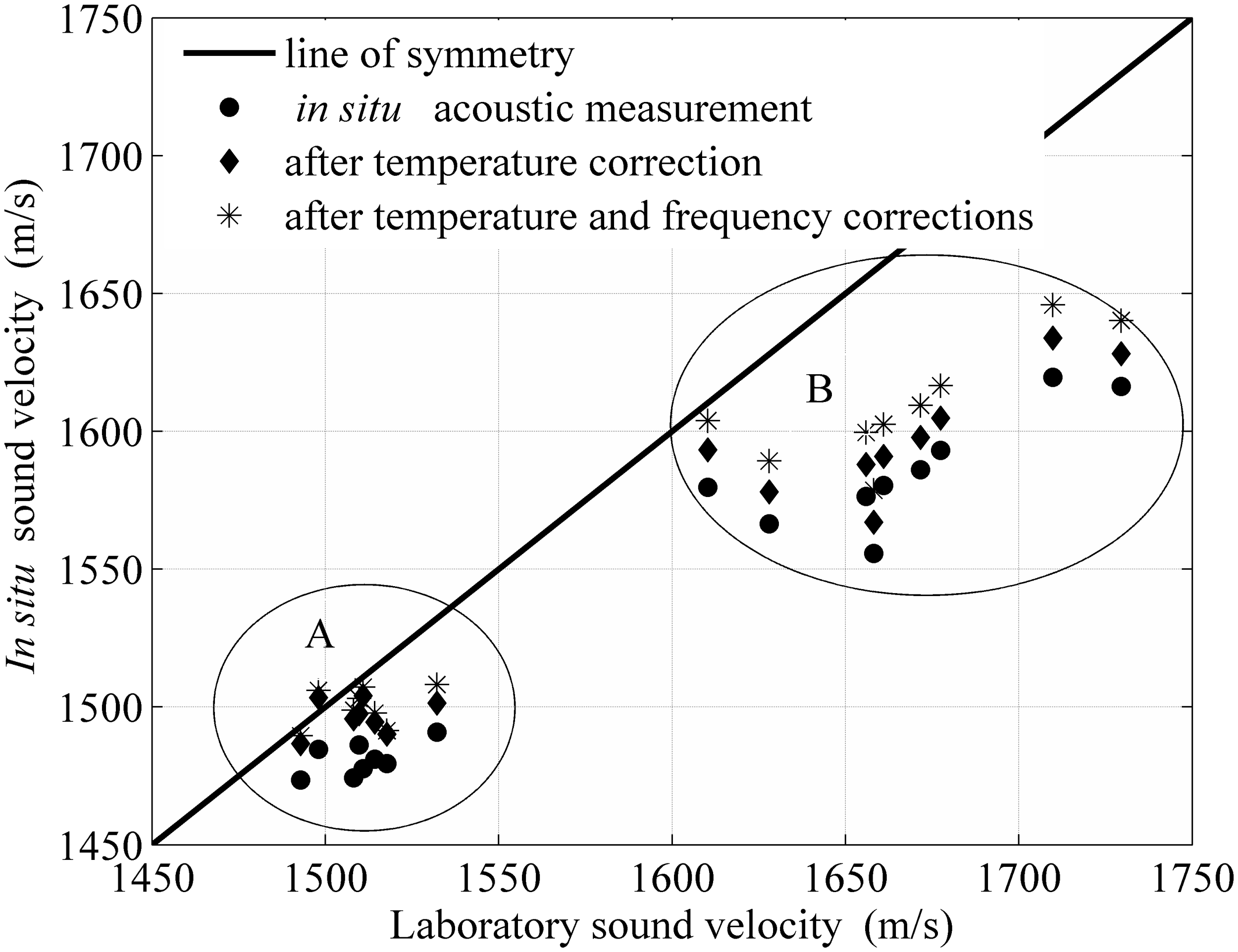 Comparison of sound velocity measured in situ and in laboratory before and after temperature correction and frequency correction.