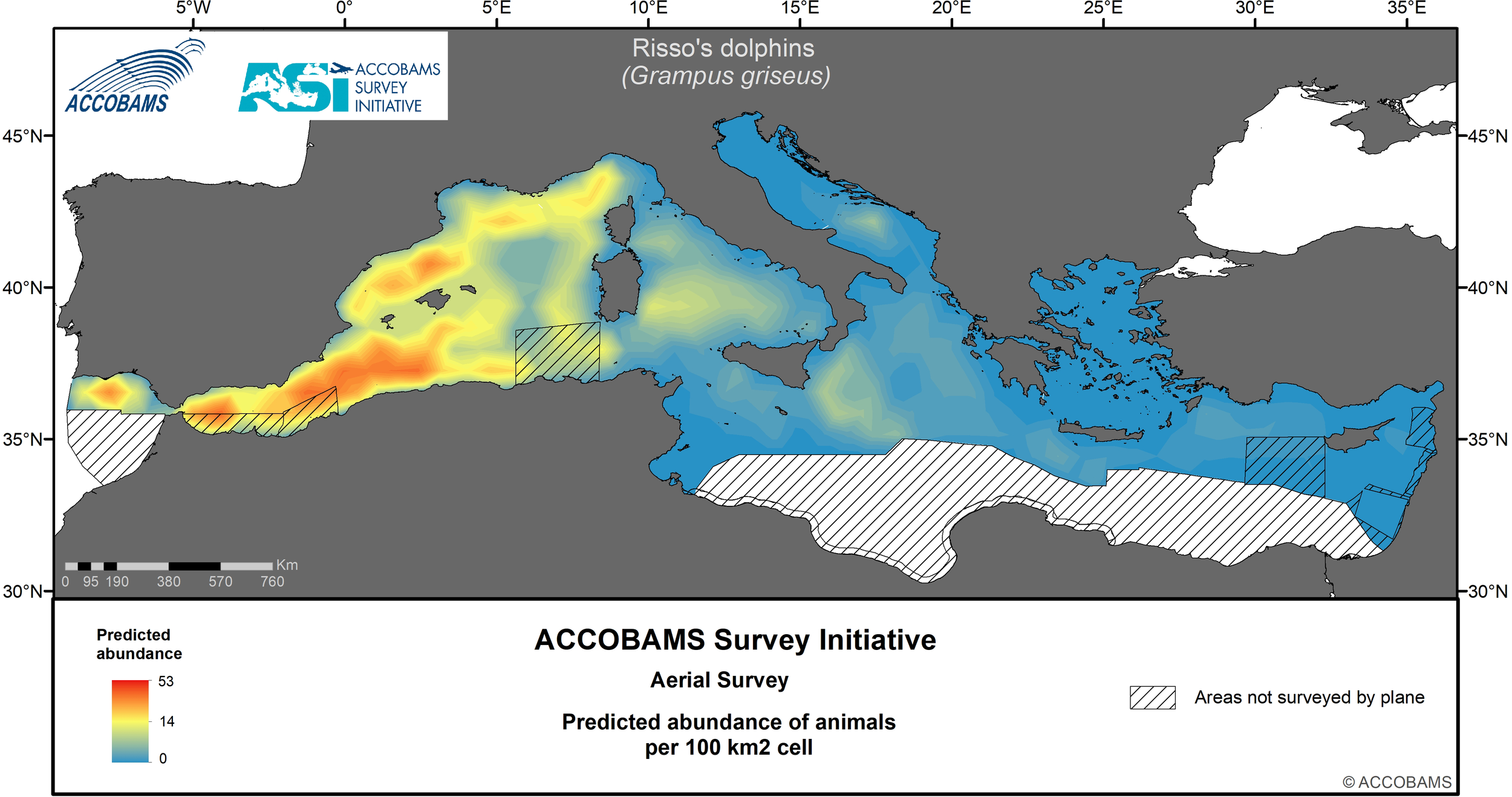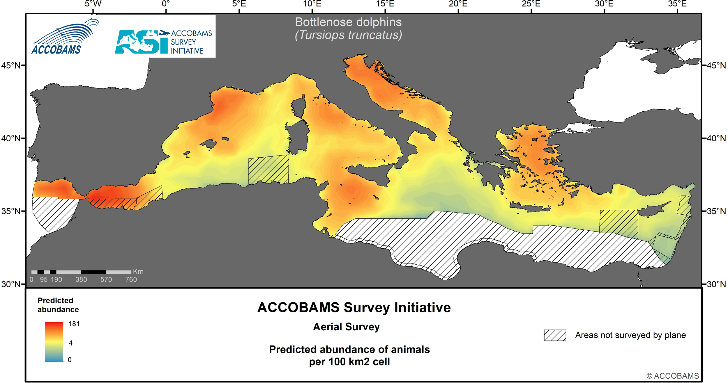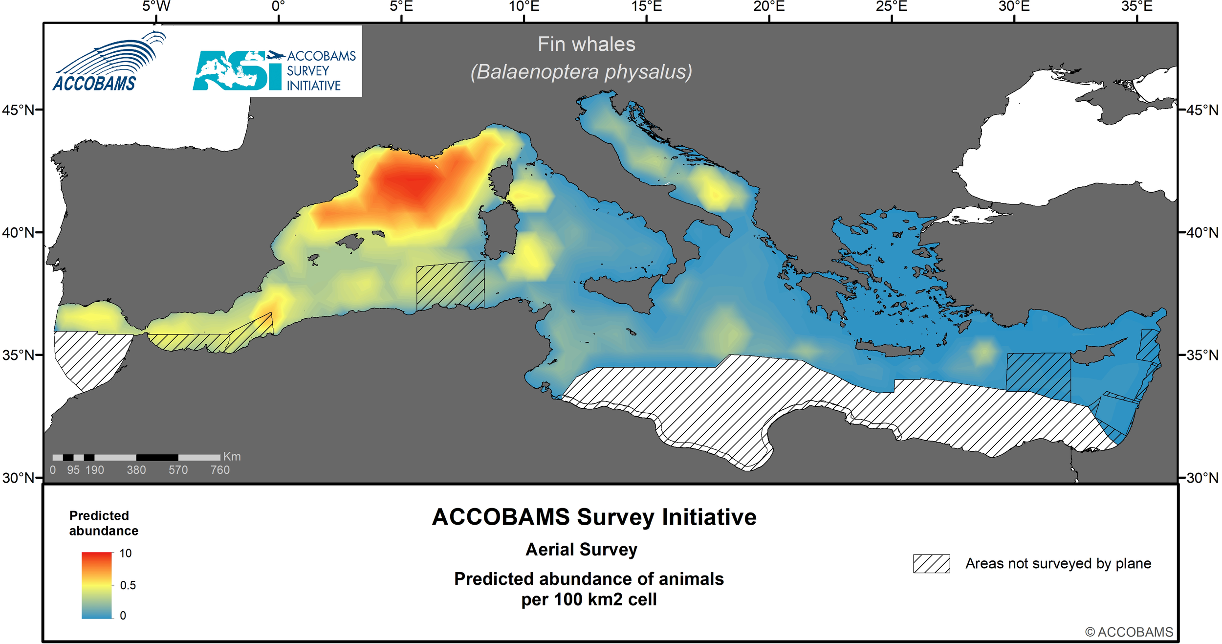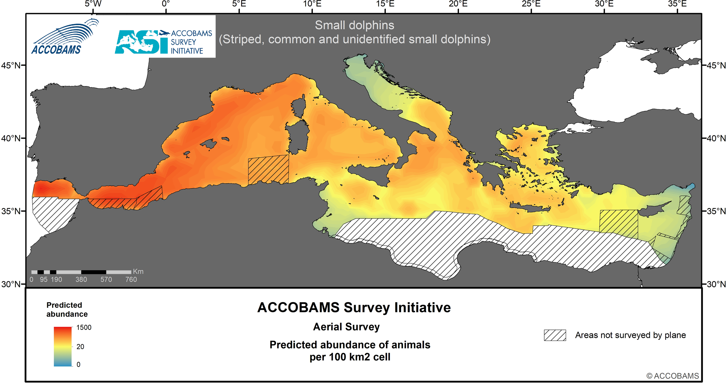 The ACCOBAMS Survey Initiative (ASI) is the first synoptic large-scale survey of the entire ACCOBAMS Area and as such it plays a key role in filling the current gaps in our biological and ecological knowledge of large vertebrate species occurring in the region. Data gathered during the ASI were analyzed in a distance sampling surface-modelling framework to assess the summer distribution, densities and patterns, as well as to investigate the correlates of these parameters, for large vertebrate species and taxa in the Mediterranean Basin. Static and dynamic explanatory variables, including water depth (m), distance to depth contours (km), distance to canyons and seabed slope (km), sea surface temperature (°C), mixed layer depth (m) and levels of chlorophyll-a (mg/l), were considered to predict density and compute its variance spatially at a resolution of 10x10 km. A strong longitudinal gradient from low densities in the east to high densities in the west is shared by most taxa. In addition, several taxa also showed a less marked latitudinal gradient varying in direction according to species, and finally, a few of them exhibited patchy distributions.