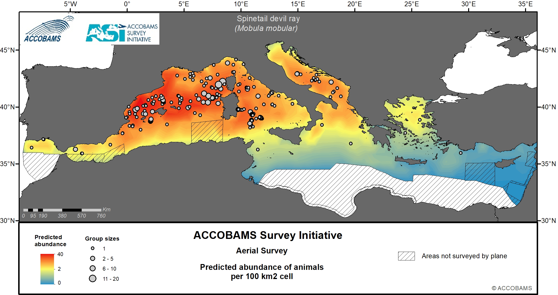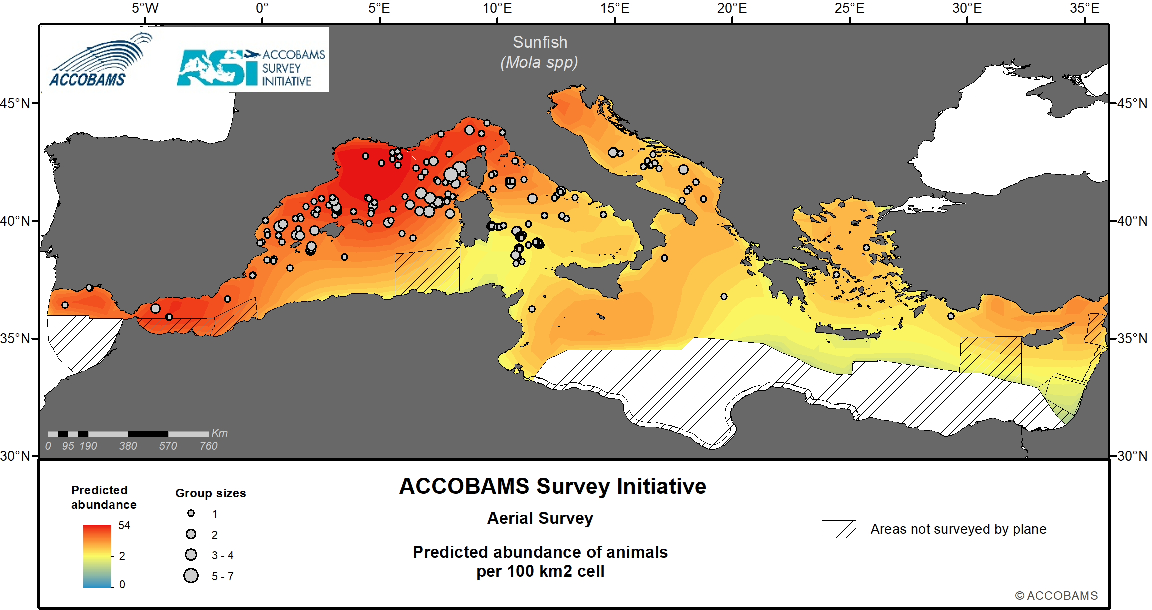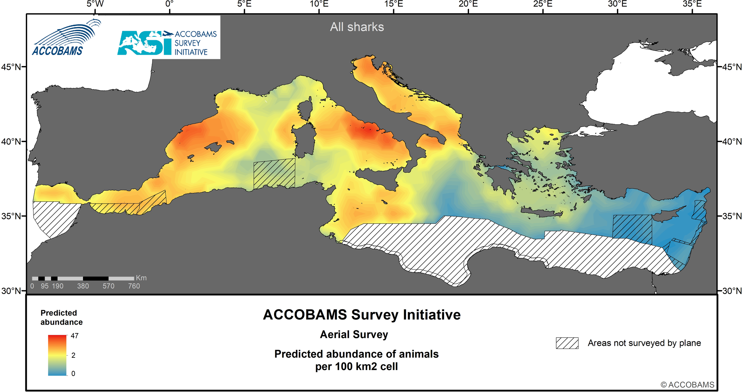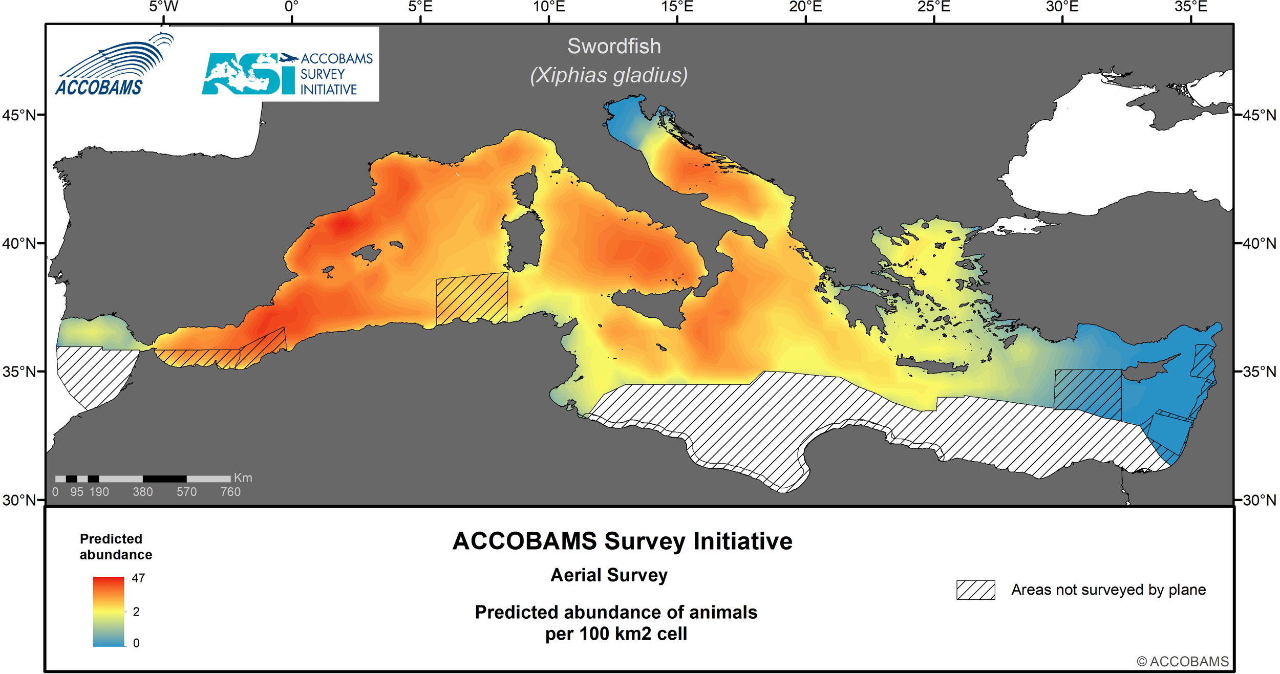 The ACCOBAMS Survey Initiative (ASI) is the first synoptic large-scale survey of the entire ACCOBAMS Area and as such it plays a key role in filling the current gaps in our biological and ecological knowledge of large vertebrate species occurring in the region. Data gathered during the ASI were analyzed in a distance sampling surface-modelling framework to assess the summer distribution, densities and patterns, as well as to investigate the correlates of these parameters, for large vertebrate species and taxa in the Mediterranean Basin. Static and dynamic explanatory variables, including water depth (m), distance to depth contours (km), distance to canyons and seabed slope (km), sea surface temperature (°C), mixed layer depth (m) and levels of chlorophyll-a (mg/l), were considered to predict density and compute its variance spatially at a resolution of 10x10 km. A strong longitudinal gradient from low densities in the east to high densities in the west is shared by most taxa. In addition, several taxa also showed a less marked latitudinal gradient varying in direction according to species, and finally, a few of them exhibited patchy distributions.