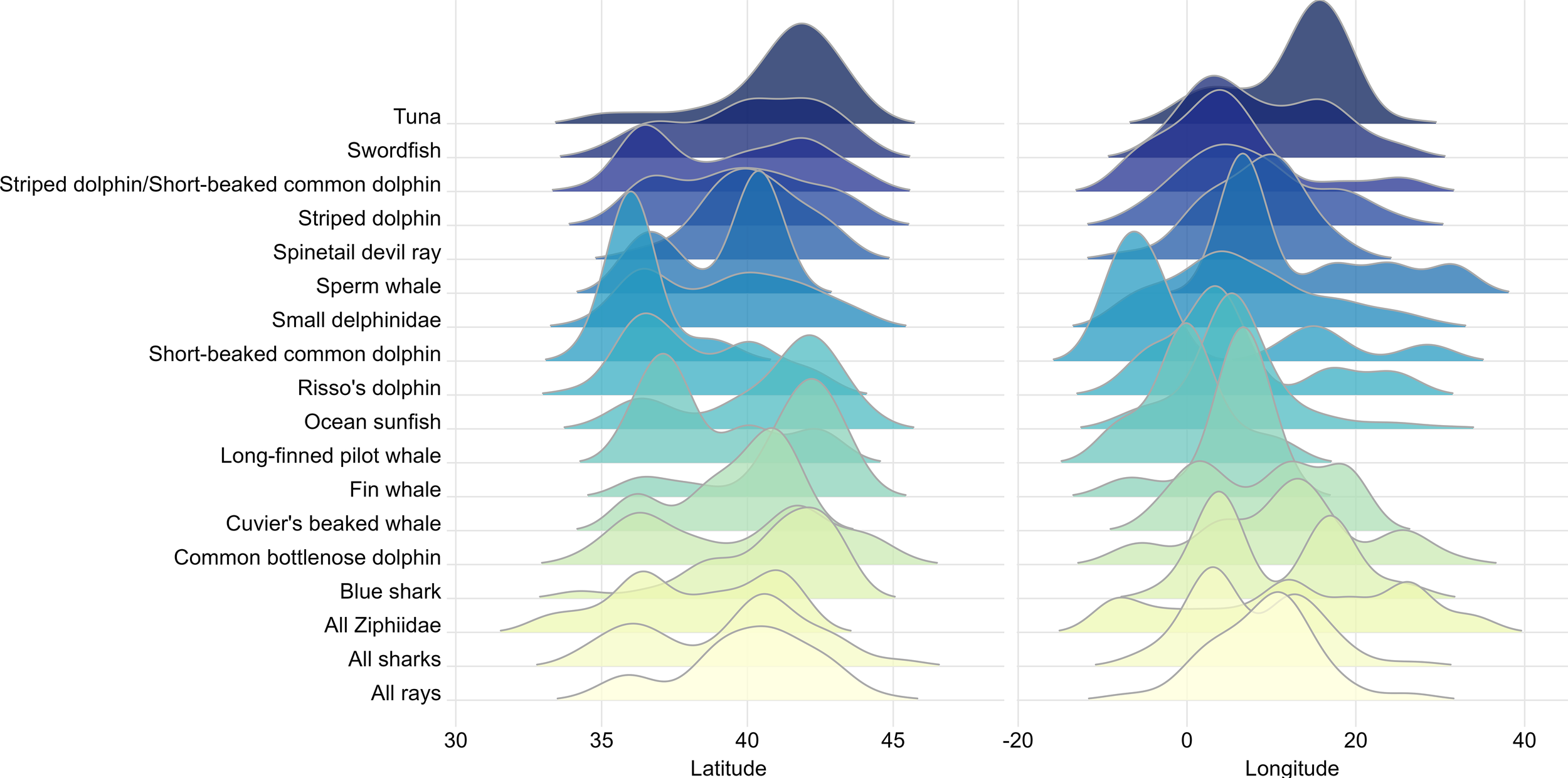 For those species for which robust model-based analyses could not be performed due to a limited sample size, density estimates based on Conventional Distance Sampling (CDS) analyses were calculated per Area. Additionally, to highlight potential latitudinal or longitudinal gradients and to help compare the distribution of sighting location by species or functional group, a plot of staggered distribution of sightings coordinates was created. For each species or functional group, the ridges in the plot show the probability density function of the sightingsā latitude and longitude estimated via a kernel density method. Plots were prepared using the stat_density_ridges() function in the package ggridges (Wilke, 2022) for the software for statistical analyses R (R Core Team, 2023) with an automatic scaling of the ridgelines computed at 2.77.