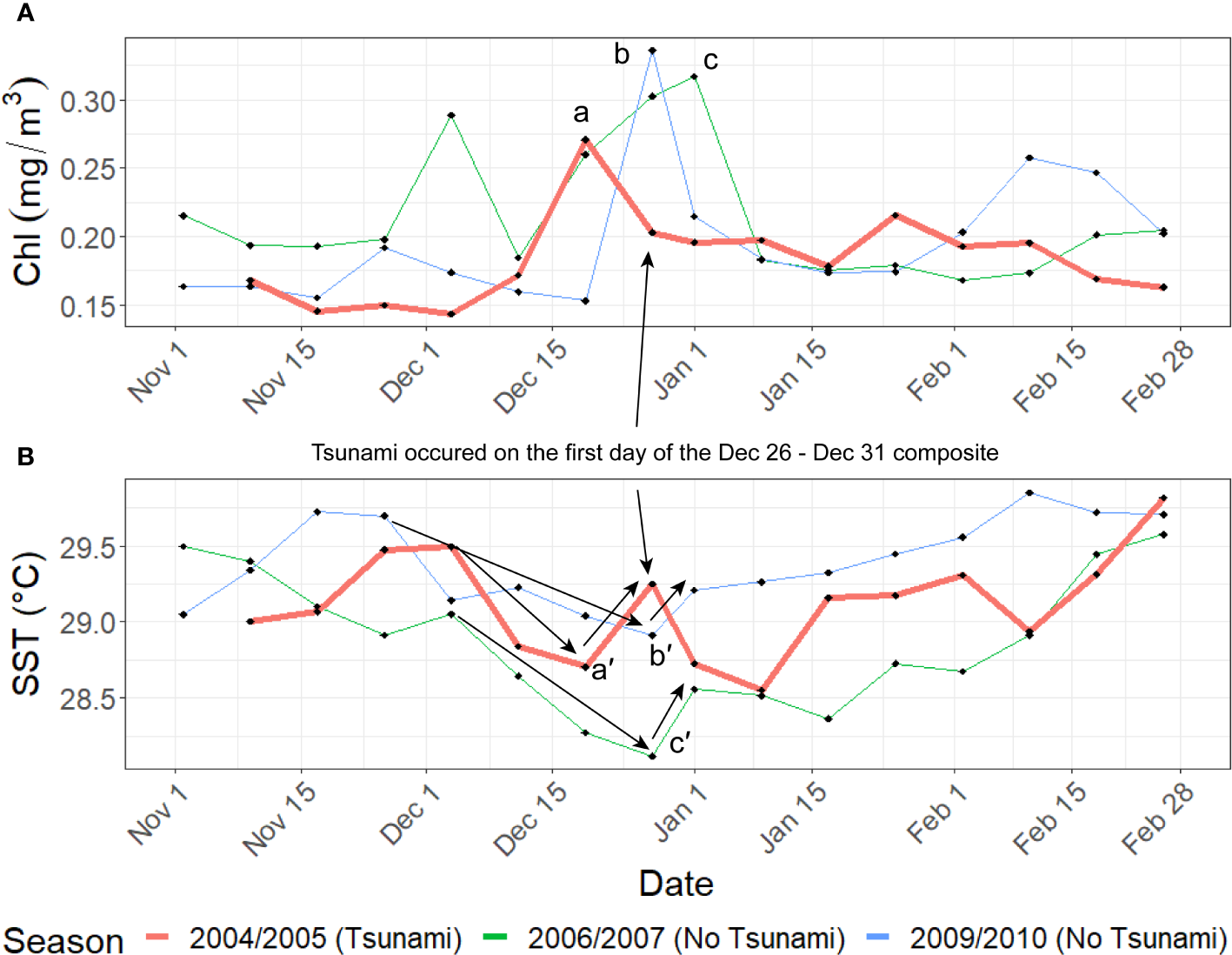 Tang D. Satyanarayana B. Zhao H. Singh R. P. (2006). A preliminary analysis of the influence of Sumatran tsunami on Indian ocean Chl-a and SST. Adv. Geosci.5, 15–20. doi: 10.1142/9789812707215_0003