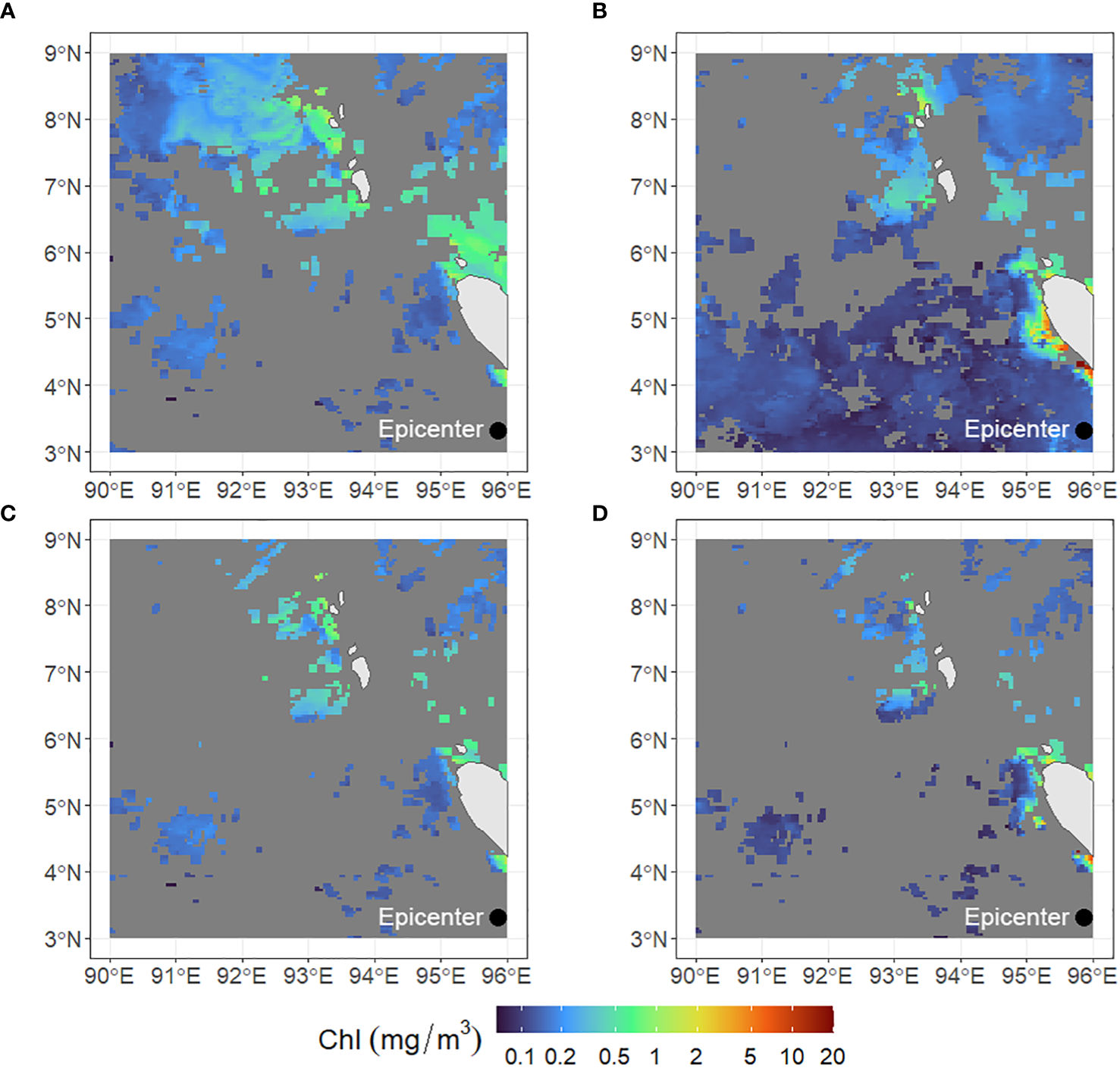 Qualitative changes in chl observed from visual inspection of satellite images were noted in several studies. Tan et al. (2007) noted decreased chl in Malacca Strait after the Sumatran tsunami of 2004, while increased chl was observed near Northwestern Sumatra (near epicenter) during the post-tsunami week. Sarangi (2011) observed increased chl in the eastern part of the Andaman Sea and Bay of Bengal along the coast of Myanmar during the post-tsunami period. The increased chl was observed to last for approximately ten days after the tsunami event. Using images before, during, and after the Japanese tsunami of 2011, Sarangi (2012) observed increased chl in coastal waters.