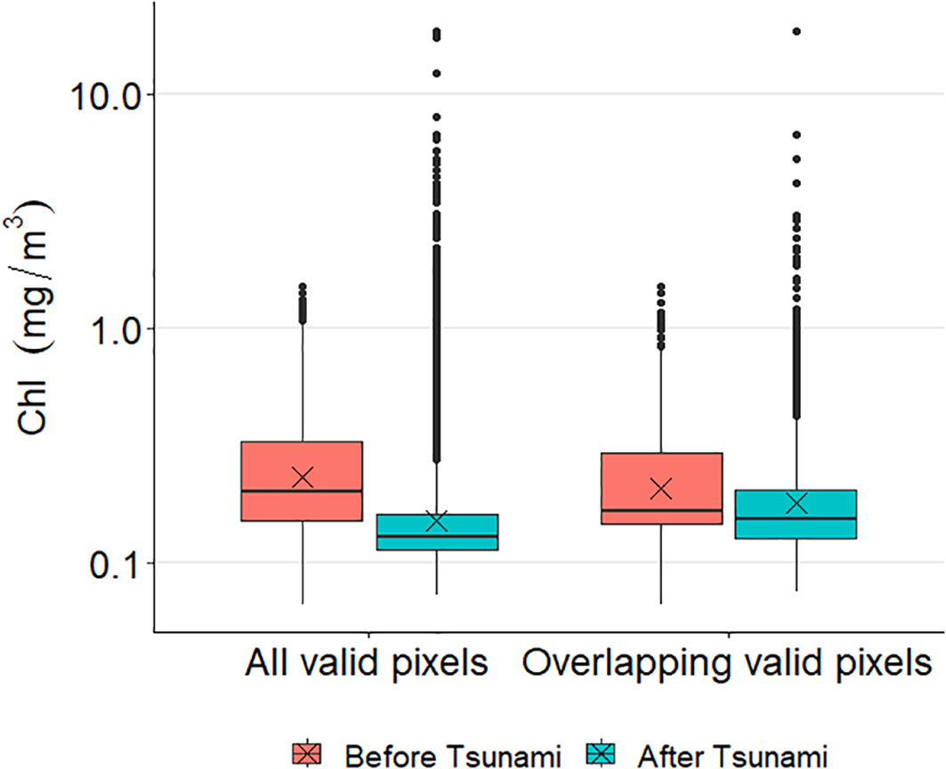 Reported changes in chl ranged from no change to ~50x pre-tsunami levels, with some studies only reporting a qualitative change in concentration or distribution of chl based on visual inspection of the pre- and post-tsunami images. Tan et al. (2007) and Siswanto and Hashim (2012) noted that high turbidity caused by turbulent mixing in coastal areas may have contributed to higher remotely sensed chl than in situ chl values.