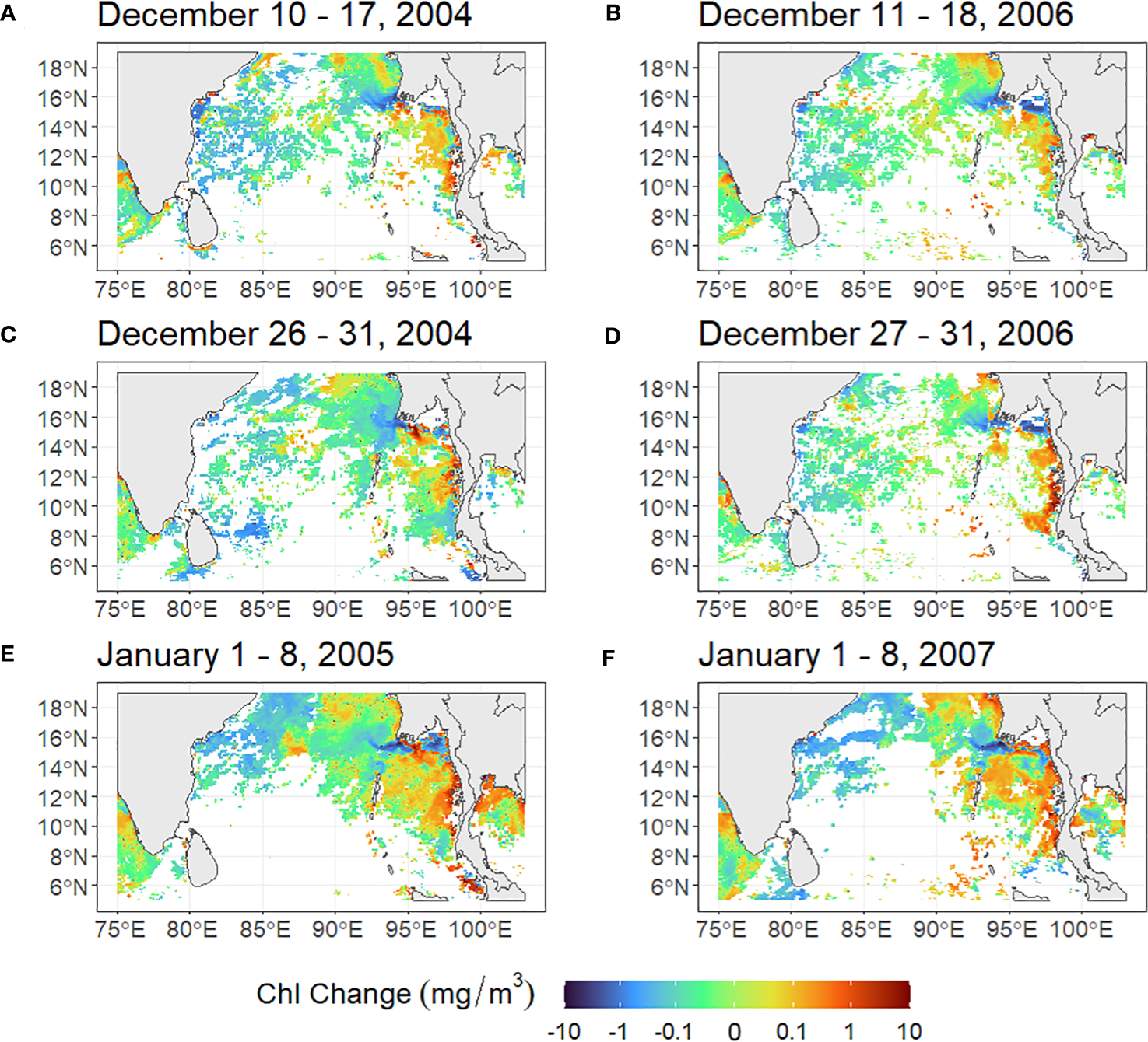 For the event reported in Haldar et al. (2013), Level 3, 9-km resolution, 8-day composite chl anomaly images were generated from SeaWiFS chl data products for the periods of December 11 – 18, 2004, December 26 – 31, 2004, and January 1 – 8 2005 for the area bounded by 4°N - 19°N, 75°E - 103°E. Anomaly images were generated by referencing these 8-day composites against the same periods in ‘normal’ years, which were defined as the average of 1999, 2000, and 2003 for the December composites and as 2000 for the January composites, following Haldar et al. (2013). Similar maps for the 2006/2007 season were also created to provide an additional comparison not included in Haldar et al. (2013).