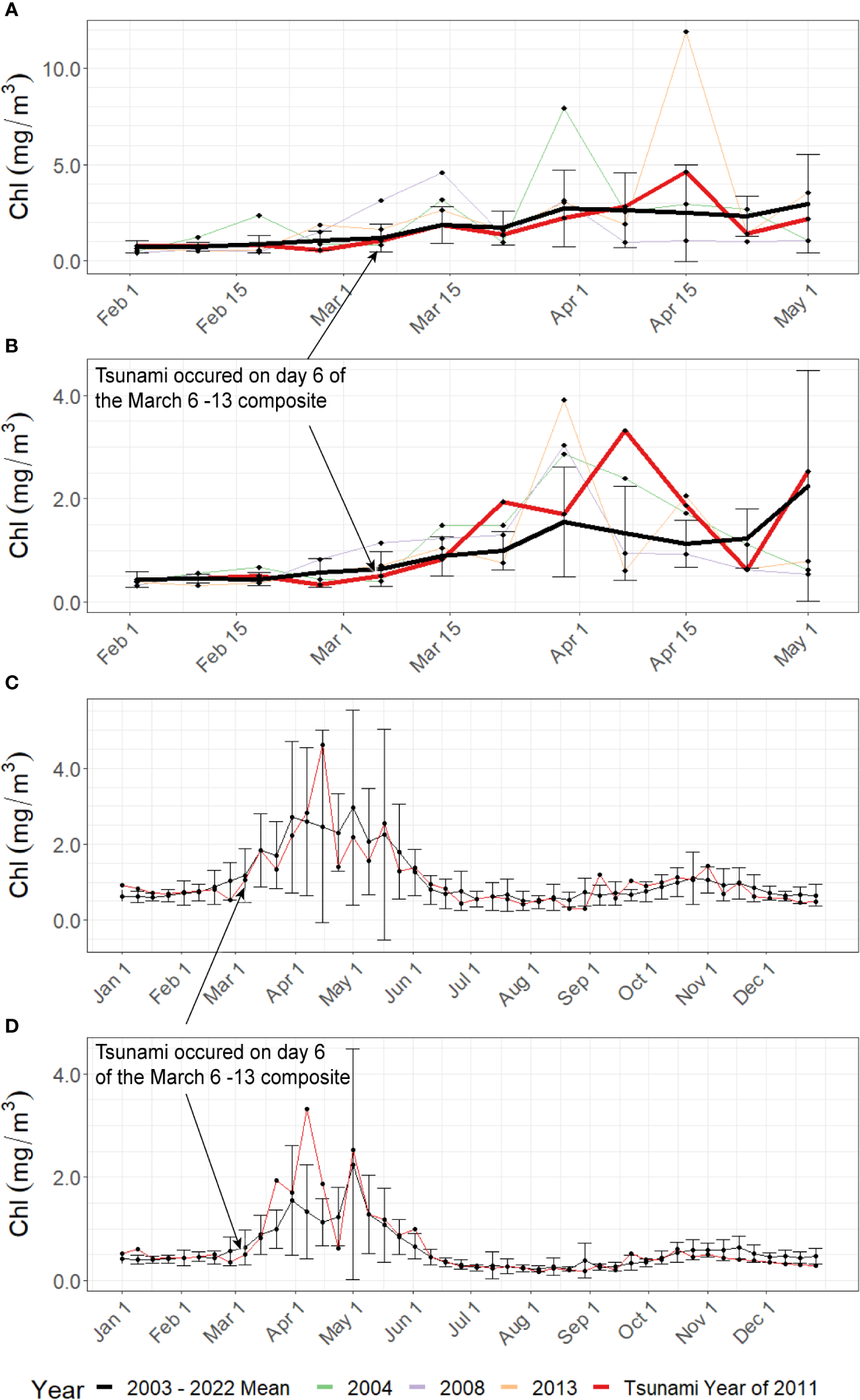 Sava E. Edwards B. Cervone G. (2014). Chlorophyll increases off the coasts of Japan after the 2011 tsunami using NASA/MODIS data. Nat. Hazards Earth Syst. Sci.14 (8), 1999–2008. doi: 10.5194/nhess-14-1999-2014