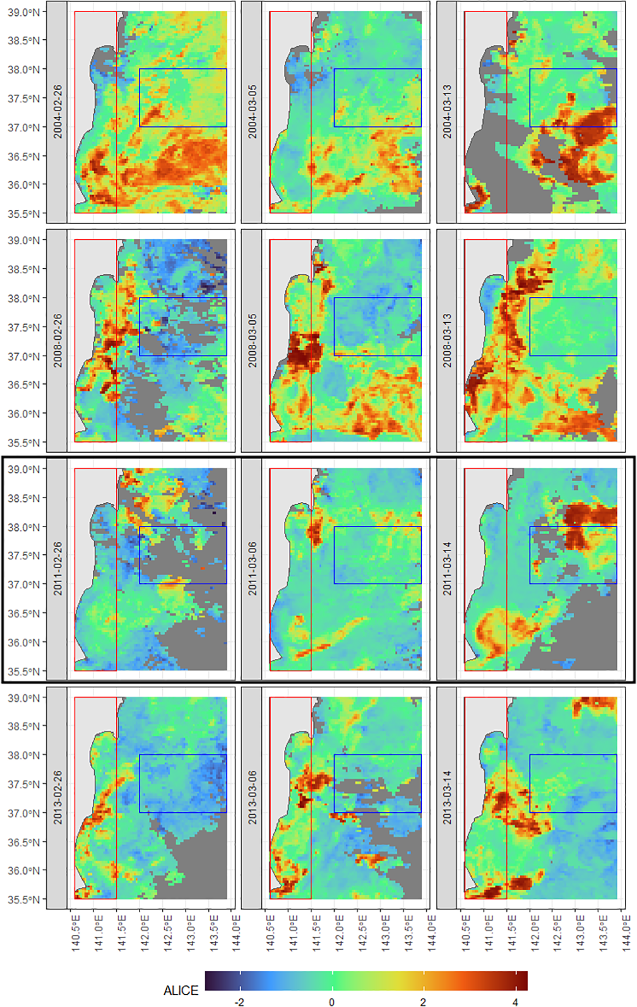 For the event reported in Sava et al. (2014), Level 3, 4-km resolution, 8-day composite chl from MODIS/AQUA was obtained for the areas 35.5°N – 39.0°N, 140.6°E – 141.5°E and 37.0°N – 38.0°N, 141.0°E – 143.9°E for the period of February 2nd through May 8th, 2011. Chl was spatially averaged over each study area for the composite periods. The same data was obtained for the same date range in other years. Additionally, statistical analysis of the region 35.5°N - 39°N and 140.6°E – 143.9°E was performed using the Robust Satellite Techniques (RST) after (Ciancia et al., 2018). Mean and standard deviation of 3 consecutive 8-day periods starting February 26 of each year were calculated for each pixel. The Absolutely Local Index of Change of the Environment (ALICE) anomaly index for chl for 8-day periods was calculated by subtracting the mean chl from the 8-day composite and dividing by the standard deviation at each pixel.