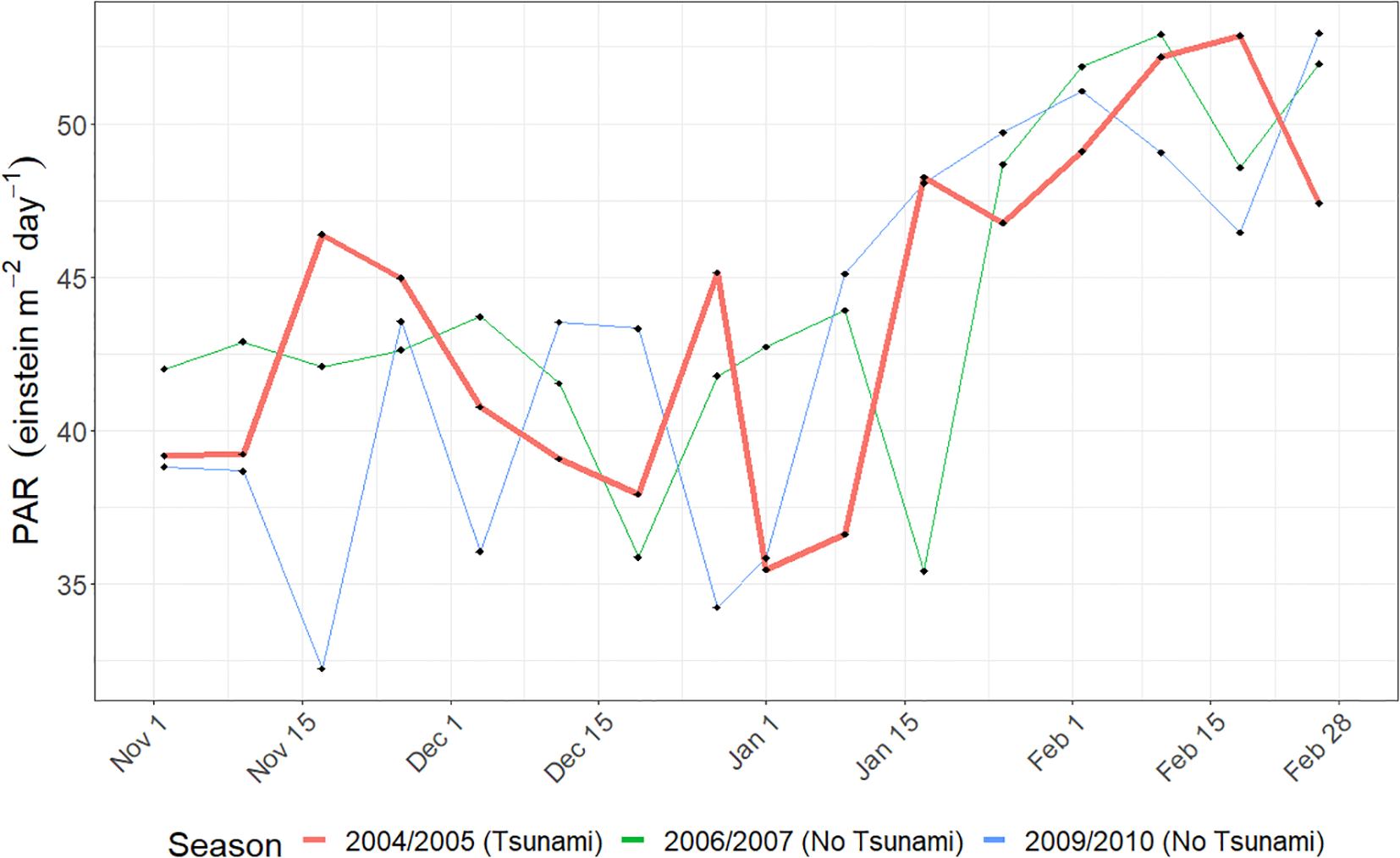 In addition to the remote sensing studies listed in Tables 1–4, there have also been in situ observations of post-tsunami changes in oceanographic conditions. These scarce observations yielded inconclusive results for chl and SST, but showed increased turbidity after the tsunami events (Table 5). However, it is difficult to know whether the increased turbidity was due to disturbance by the tsunami or other factors such as rainfall, while rainfall was discounted by Fiedler et al. (2014) as a possible factor leading to the post-tsunami changes in turbidity.