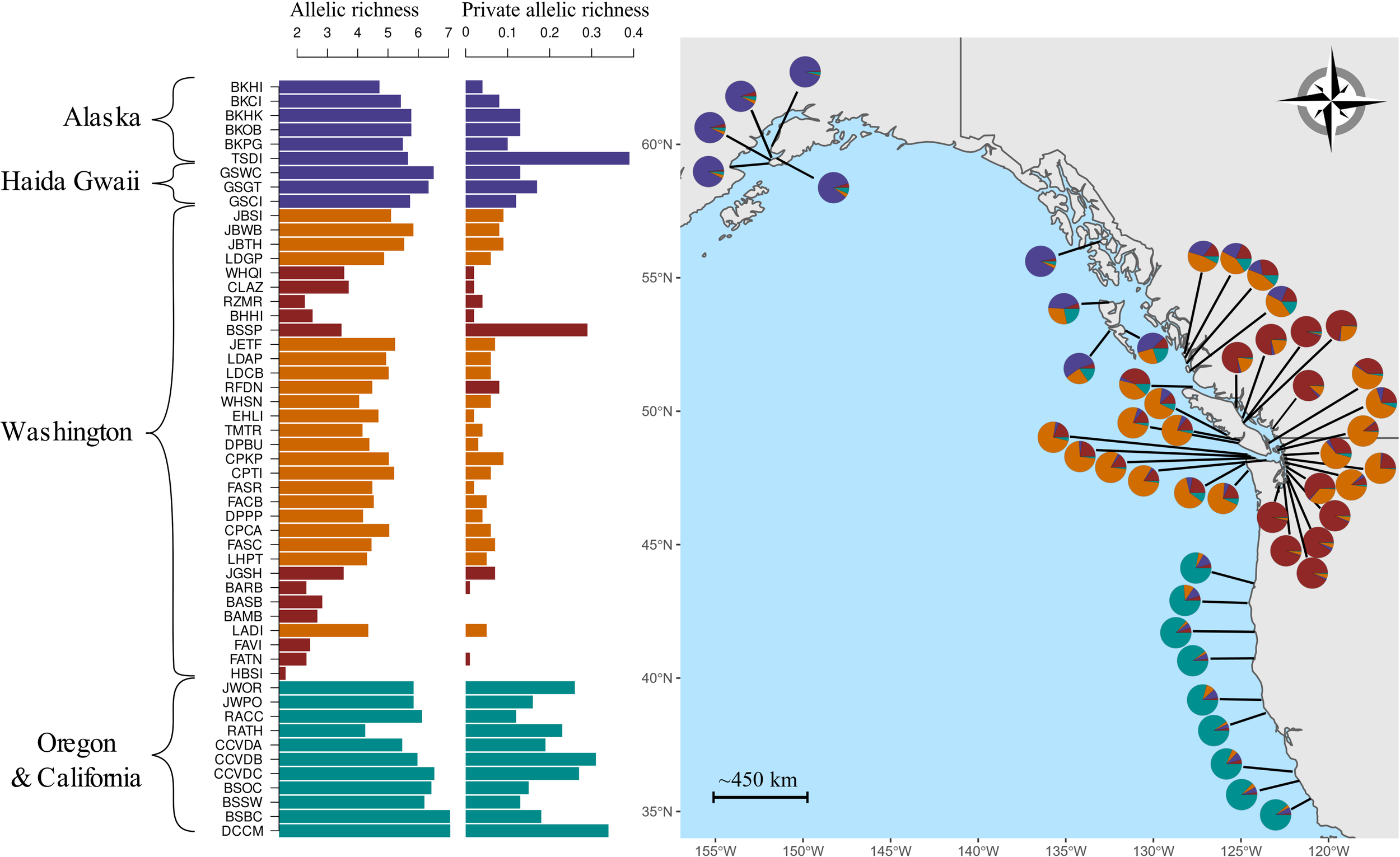 At the species distribution scale, we found four main groups of genetic co-ancestry, Alaska; Washington with Vancouver Island’s outer coast and Juan de Fuca Strait; Washington’s inner Salish Sea; and Oregon with California. The highest allelic richness (AR) levels were found in California, near the trailing range edge, although AR was also high in Alaska. The inner Salish Sea region had the poorest diversity across the species distribution. Nevertheless, a pattern of isolation by hydrodynamic transport and environment was supported in this region.