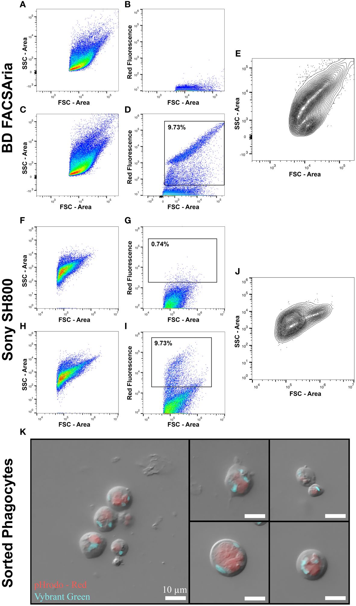 Phagocytosis is a fundamental cell behavior central to many metazoan cell processes, including nutrient uptake and immune response (Hartenstein and Martinez, 2019). Cells competent for phagocytosis can be readily identified using FACS by selecting cells that have internalized fluorescent particles (Lehmann et al., 2000). To assess whether FACS could be applied to target, isolate and collect Mnemiopsis phagocytes, we incubated heterogeneous cell suspensions with pHrodo E. coli BioParticles along with MCM alone as control cell suspensions. We analyzed samples on both Sony SH800 and BS FACSAria Fusion flow cytometry systems to compare fluorescent and FSC/SSC profiles (Figure 5). Control samples show a normal FSC/SSC profile (Figures 5A, F, compare to Figure 1C) and low levels of fluorescence (Figures 5B, G). The FSC/SSC profile of pHrodo incubated samples show an increase in SSC, indicative that intracellular granularity has increased in cells that have phagocytosed bacteria (Figures 5C, H). We also observed a shift in fluorescent signal in approximately 9-15% of cells across replicates, signifying that these cells had sequestered bacteria into low pH vesicles, activating fluorescence (pHrodo-positive cells; Figures 5C, D, H, I; Supplementary Figure 3).