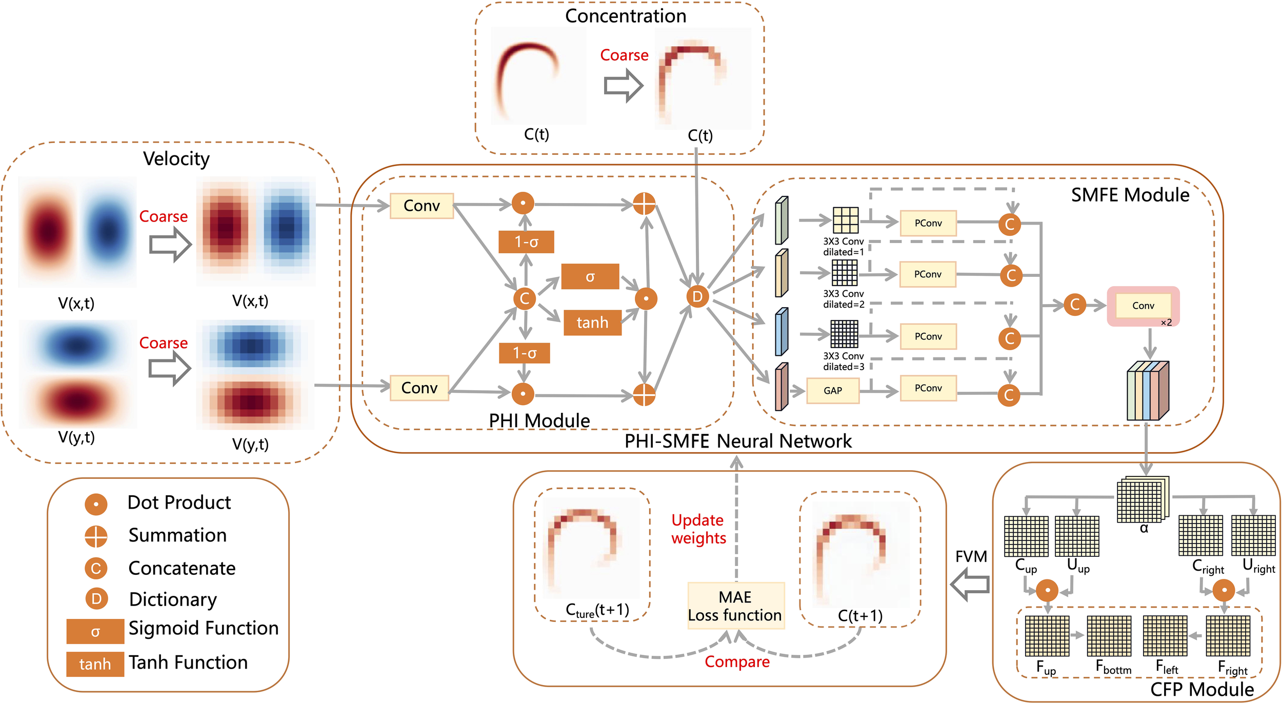 Our proposed PHI-SMFE neural network architecture. PHI module, SMFE module, and CFP module are the abbreviations of Physical heterogeneous interaction module, Spatial multi-scale feature extraction module, and Concentration field prediction module, respectively. The input velocity field and concentration field at the current moment pass through the above three modules in turn to obtain the concentration field at the next moment.