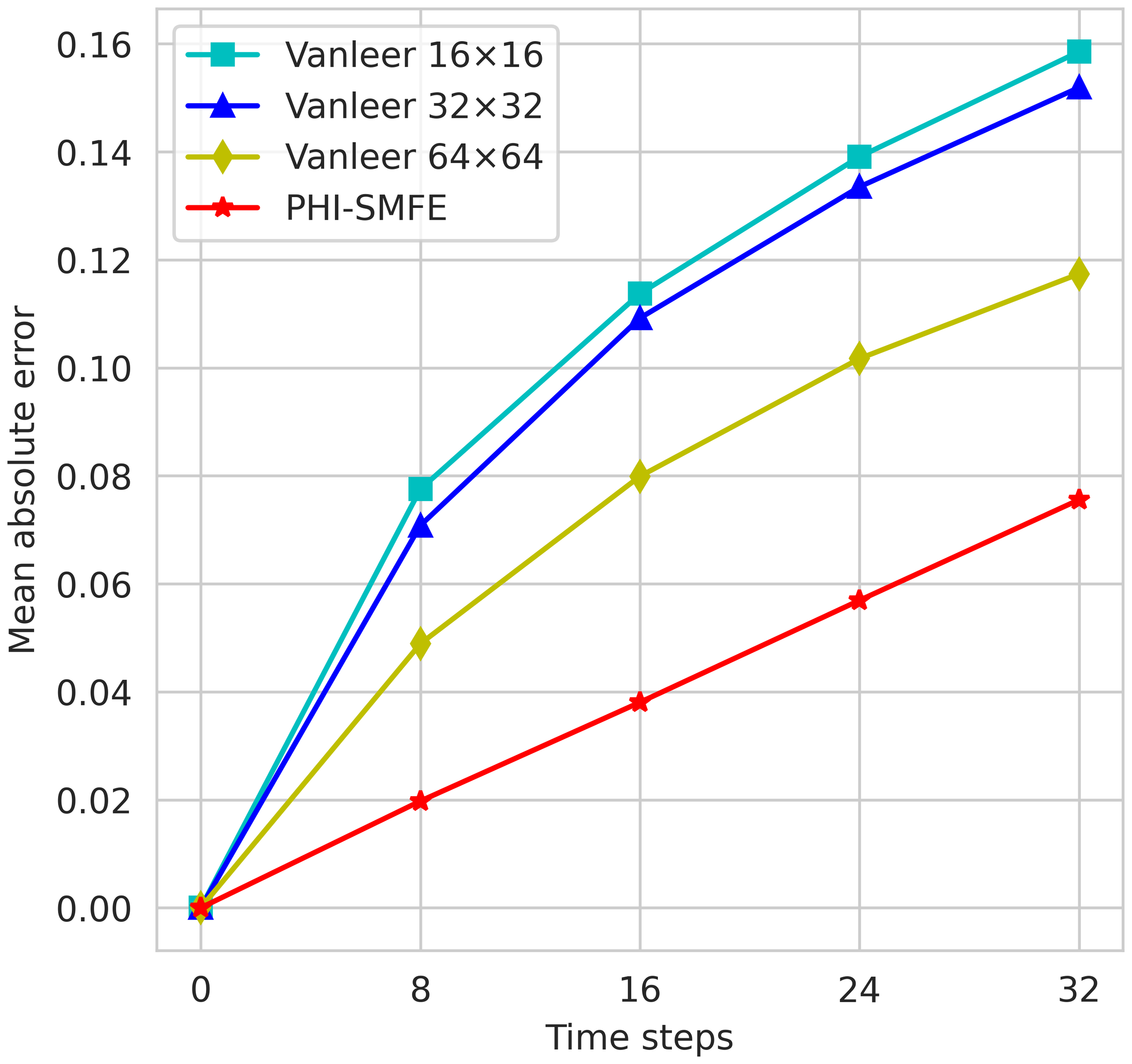 We conducted experiments using an unsteady dynamic flow field dataset to compare the performance of the proposed PHI-SMFE model with the traditional SOTA numerical simulation Van Leer solver. The traditional numerical simulation baseline schemes selected for passive scalar advection under 2D unsteady flow include the following:(1)Second-order Van Leer advection transport scheme with a grid resolution of 16x16 (Lin et al., 1994). (2)Second-order Van Leer advection transport scheme with a grid resolution of 32x32 (Lin et al., 1994). (3)Second-order Van Leer advection transport scheme with a grid resolution of 64x64 (Lin et al., 1994). The superiority of the second-order Van Leer method in transporting fluids with steep gradients, while avoiding unrealistic oscillations and negative mixing ratios, is showcased in low-resolution atmospheric simulations involving active cumulus convection. This state-of-the-art scheme replaces the fourth-order central difference scheme (Li et al., 1995) and has been implemented in the simulation of the general circulation of the atmosphere at the Goddard Laboratory. Figure 2 illustrates the comparative outcomes of the cumulative errors over multiple time steps between the PHI-SMFE model and the Van Leer method.