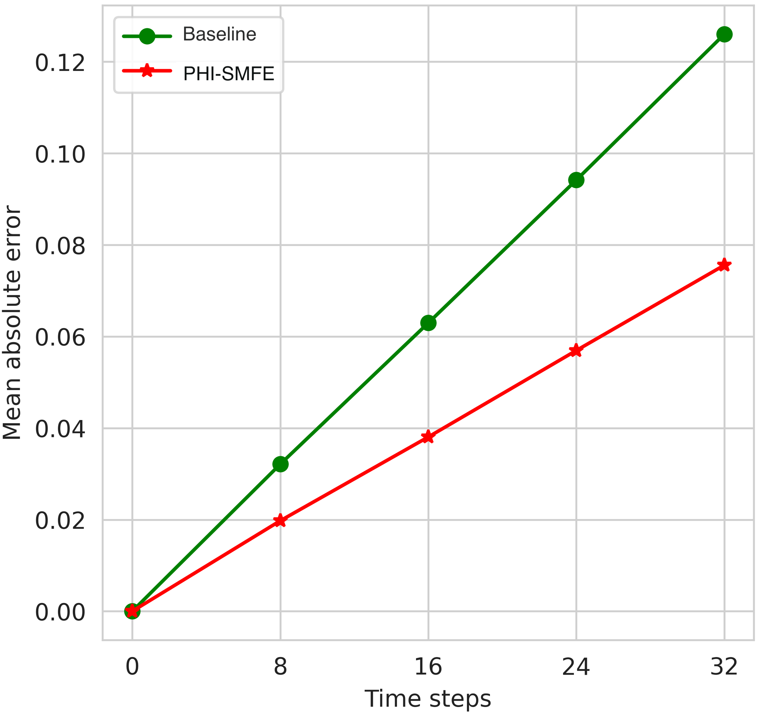 Our experimental comparison focuses on the advection of passive scalar in 2D turbulent flow. Specifically, we evaluate the performance of our proposed PHI-SMFE model against the baseline method CNN-FVM. In terms of single-step prediction, the CNN-FVM method achieves an inference error of 0.0044 and an inference time of 0.1781s. The average training time per epoch during the training phase is 4ms. On the other hand, our PHI-SMFE model achieves an improved performance with an inference error of 0.0027, an inference time of 0.0752s, and an average training time of 450us per epoch. Overall, our PHI-SMFE model demonstrates a significant enhancement in both single-step simulation accuracy, which has increased by 38%, and single-step inference speed, which has improved by 58%. These results position our model at the forefront of the current state-of-the-art performance. Additionally, we conducted tests to evaluate the cumulative loss over multiple time steps. The comparison of multi-step cumulative errors between PHI-SMFE and CNN-FVM is illustrated in Figure 3. The results demonstrate that PHI-SMFE exhibits a more gradual cumulative growth of error compared to the baseline Conv-FVM. Additionally, the overall loss at 32-time steps is reduced by 41% in PHI-SMFE, indicating its capability to significantly enhance simulation inference accuracy across multiple time steps.