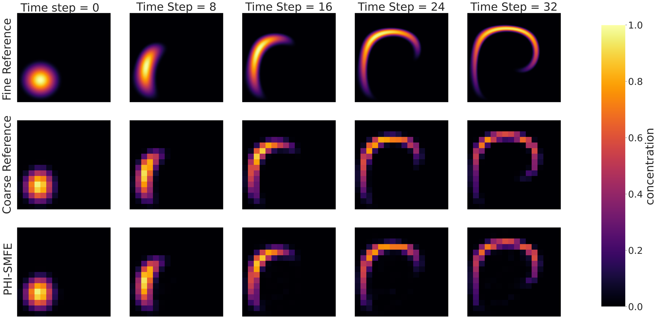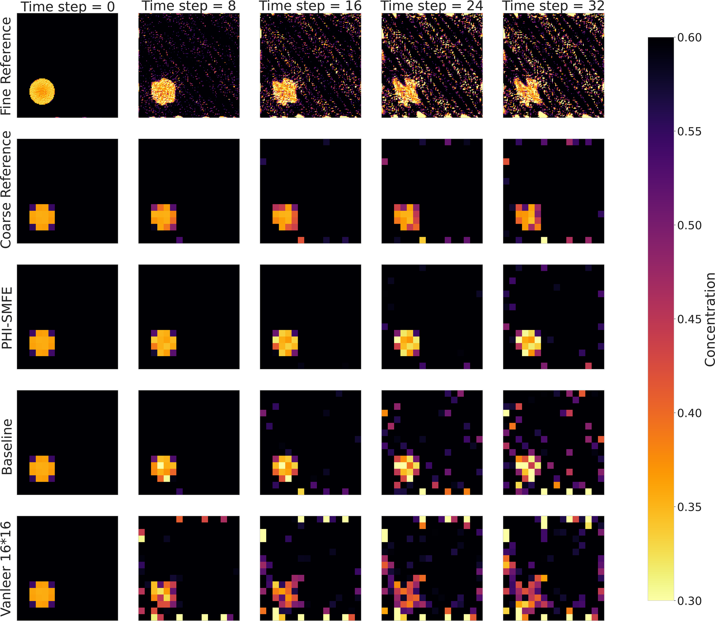 Visualization of predictions of the evolution of the initial concentration field after 32 time-step iterations of different models under a unsteady fluid field dataset. The third row represents the prediction results of the proposed PHI-SMFE model.