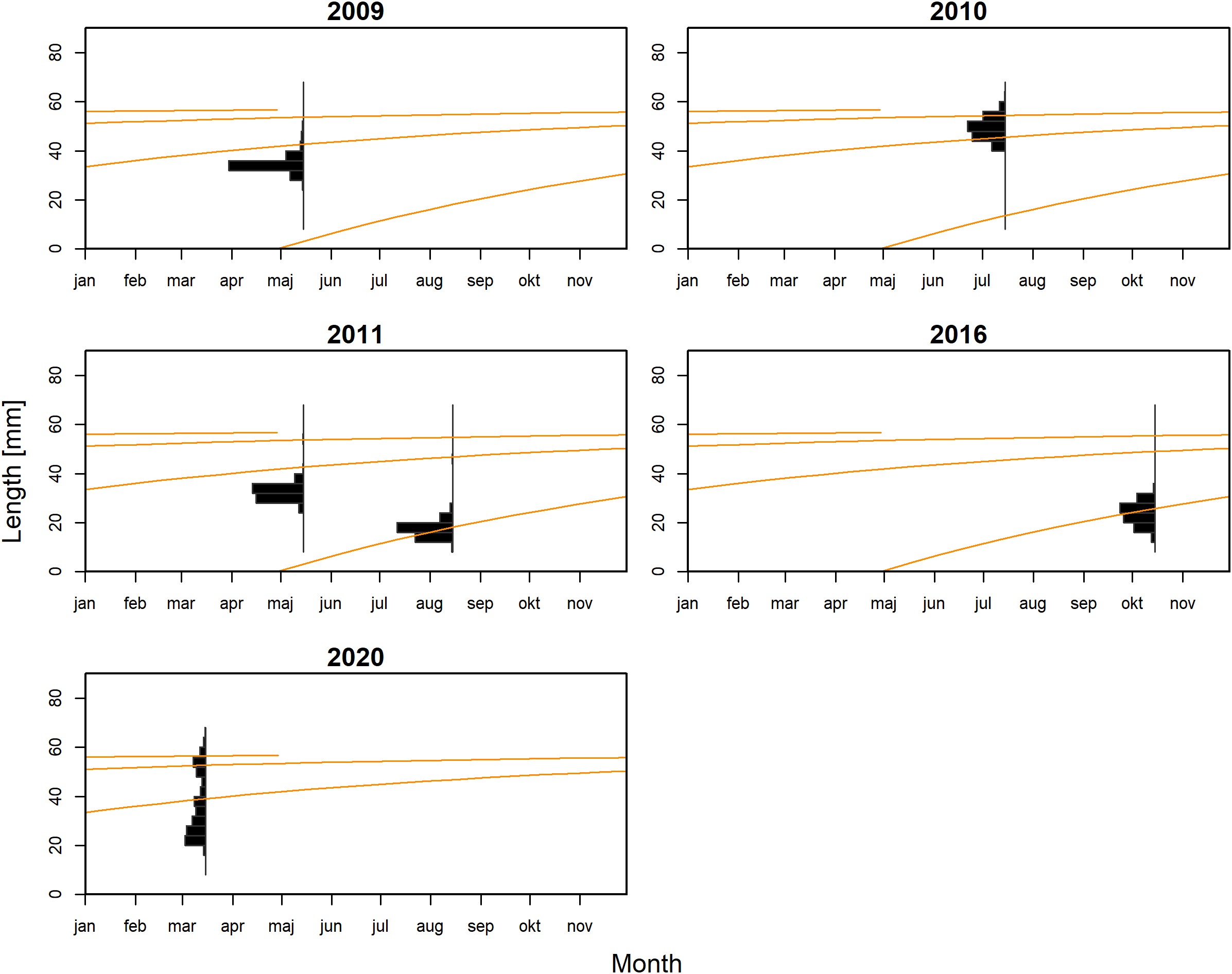 The von Bertalanffy growth curves of Maurolicus muelleri fitted to the length-frequency data.