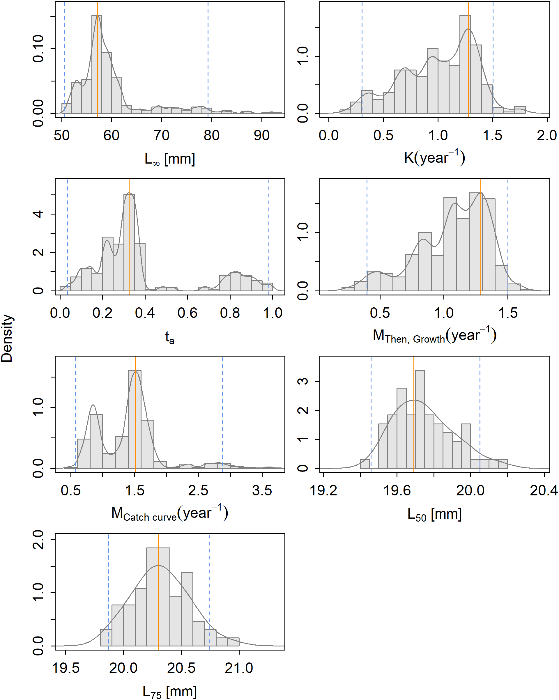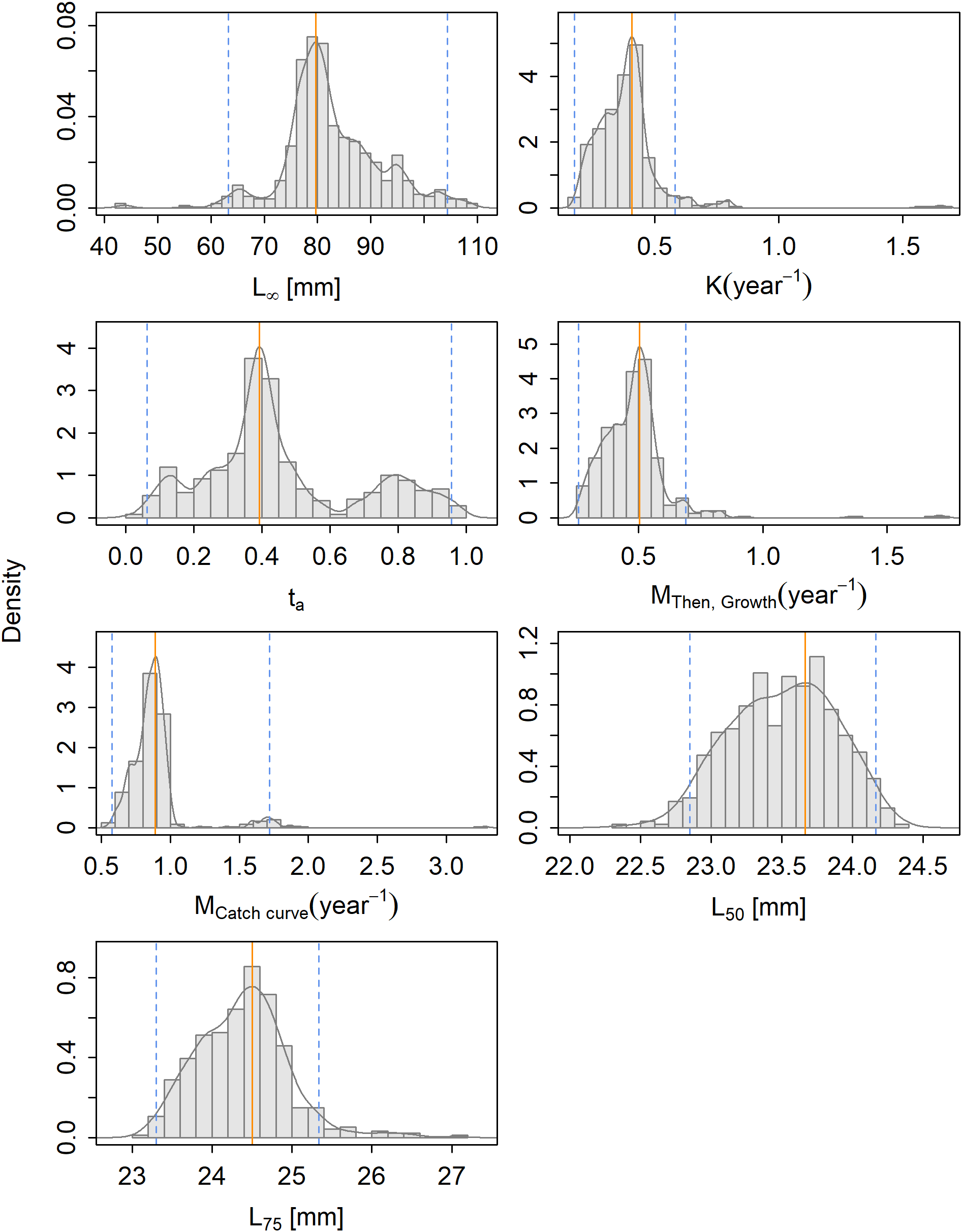 The density of the parameter estimates resulting from the bootstrapping of the selected model for Maurolicus muelleri with the maximum density estimate (solid orange line) and the 95% confidence interval (striped blue line).