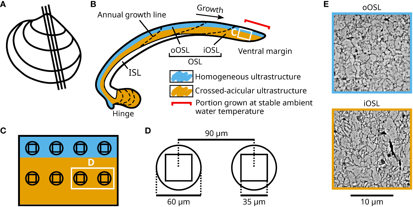 Overview of the sampling positions for ultrastructural and in-situ element chemical analyses in shells of Arctica islandica specimens cultured at 1.1, 3.2, 6.2, 9.2, 10.3, 12 and 15°C. (A) Depiction of a left valve from a cultured specimen illustrating the cutting axes of the studied shell. (B) Schematic representation of a shell slab. The shell is divided into an inner and outer shell layer (ISL, OSL), separated by the myostracum. The outer portion of the OSL (oOSL) primarily consists of homogeneous ultrastructure (blue), while crossed-acicular ultrastructure (orange) dominates in the inner portion of the OSL (iOSL). The portion of the shell grown during the experimental interval is indicated by the red bracket. (C) Enlargement of panel (B) showing the sampling positions for LA-ICP-MS and SEM for the two shell sections analyzed for every specimen. (D) Enlarged schematic representation of the SEM images (35 µm²) compared to the laser spots (60 µm diameter, 90 µm between LA centers) depicted in panel (C). (E) Example of SEM image obtained in the oOSL and the iOSL. The scale applies to both images.