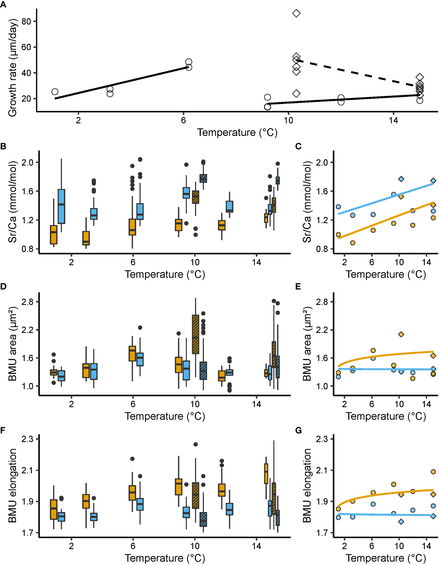 Shell growth rate (µm/day), molar Sr/Ca ratios (mmol/mol) and ultrastructural properties, i.e., biomineral unit (BMU) area (µm²) and elongation, from the outer portion of the outer shell layer (oOSL, blue) and the inner portion of the outer shell layer (iOSL, orange) of Arctica islandica specimens cultured at 1.1, 3.2, 6.2, 9.2, 10.3, 12 and 15°C. (A) Shell growth rate of studied specimens. Black solid line: linear model for Baltic Sea (BS); black dashed line: linear model for Gulf of Maine (GOM). (B) Shell Sr/Ca values and corresponding (C) median values weighted for the number of specimens (linear regression). (D) Area of the BMUs and corresponding (E) median values weighted for the number of specimens (natural logarithm regression). (F) Elongation of the BMUs and corresponding (G) median values weighted for the number of specimens (natural logarithm regression). In (A, C, E, G), circles represent data from the BS experiment, while squares stand for data from the GOM experiment. In (B, D, F), the bold black line represents the median, lower and upper limits of the boxes stand for the first and third quartiles, vertical lines denote the minimum and maximum values, and black dots equal outliers. Solid filled boxes = data from the Baltic Sea experiment; striped boxes = data from the Gulf of Maine experiment.