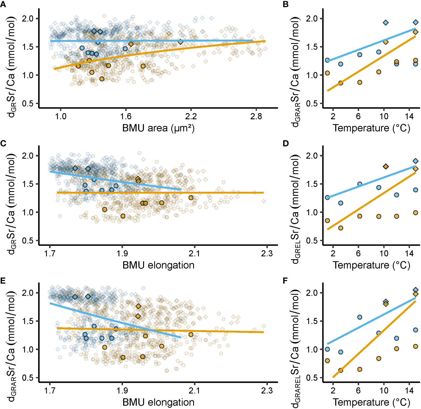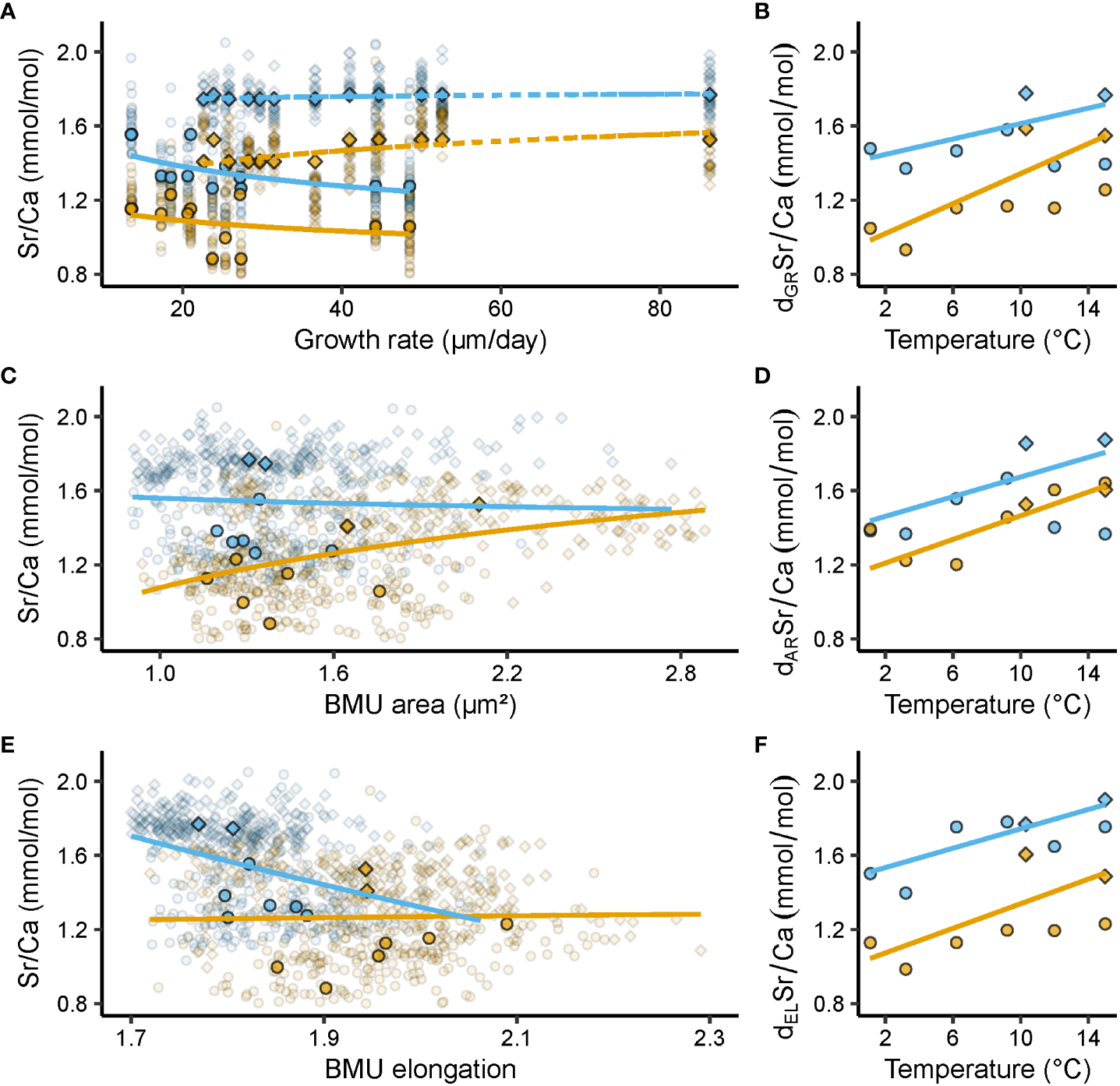 To identify potential links between shell growth rate, ultrastructure and chemical properties that could have biased the temperature sensitivity of these shell properties, crossplots were generated between (i) growth rate and Sr/Ca, (ii) Sr/Ca and ultrastructural properties, and (iii) growth rate and ultrastructural properties (BMU area and elongation). Based on these crossplots, non-linear (natural logarithm) regression models were computed and subsequently used to detrend the chemical and ultrastructural data. For this purpose, predicted values given by these regression models were subtracted from the chemical and ultrastructural data, resulting in growth rate-detrended Sr/Ca data (dGRSr/Ca), BMU area-detrended Sr/Ca data (dARSr/Ca) as well as BMU elongation-detrended Sr/Ca data (dELSr/Ca) i.e., residuals for each of these parameters after detrending (section 3.2). Furthermore, Sr/Ca data were mathematically corrected for combinations of growth rate and BMU area (dGRARSr/Ca), growth rate and BMU elongation (dGRELSr/Ca), as well as growth rate, BMU area and elongation (dGRARELSr/Ca). Also, the correlation with growth rate was eliminated from ultrastructural properties (section 3.2) to obtain growth rate-detrended BMU area data (dGRAR) and growth rate-detrended BMU elongation data (dGREL).
