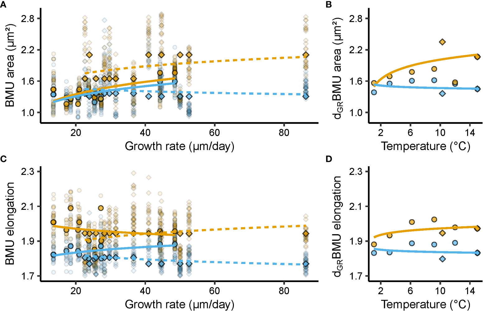 At some temperature settings, ultrastructural properties differed significantly between the oOSL and iOSL (MWU, p < 0.001) (Figures 2D, E). For example, at 1.1, 6.2 and 15°C, BMUs were significantly larger in the iOSL than in oOSL (MWU, p < 0.05), whereas nearly identical sizes were observed at the remaining studied temperature regimes (MWU, p > 0.05). In the iOSL, the weak tendency toward larger BMUs forming in warmer water was not significant (slope = 0.10 ± 0.11 µm²/°C, p > 0.05). Nevertheless, in over 66% of the temperature pairs assessed, a significant difference in the area of the BMUs was obtained (Dunn, p < 0.025, Table S2). In contrast, irrespective on the prevailing temperature, the BMU area of the oOSL remained largely unchanged (Dunn, p > 0.025 for more than 70% of the tested pairs, Table S2).