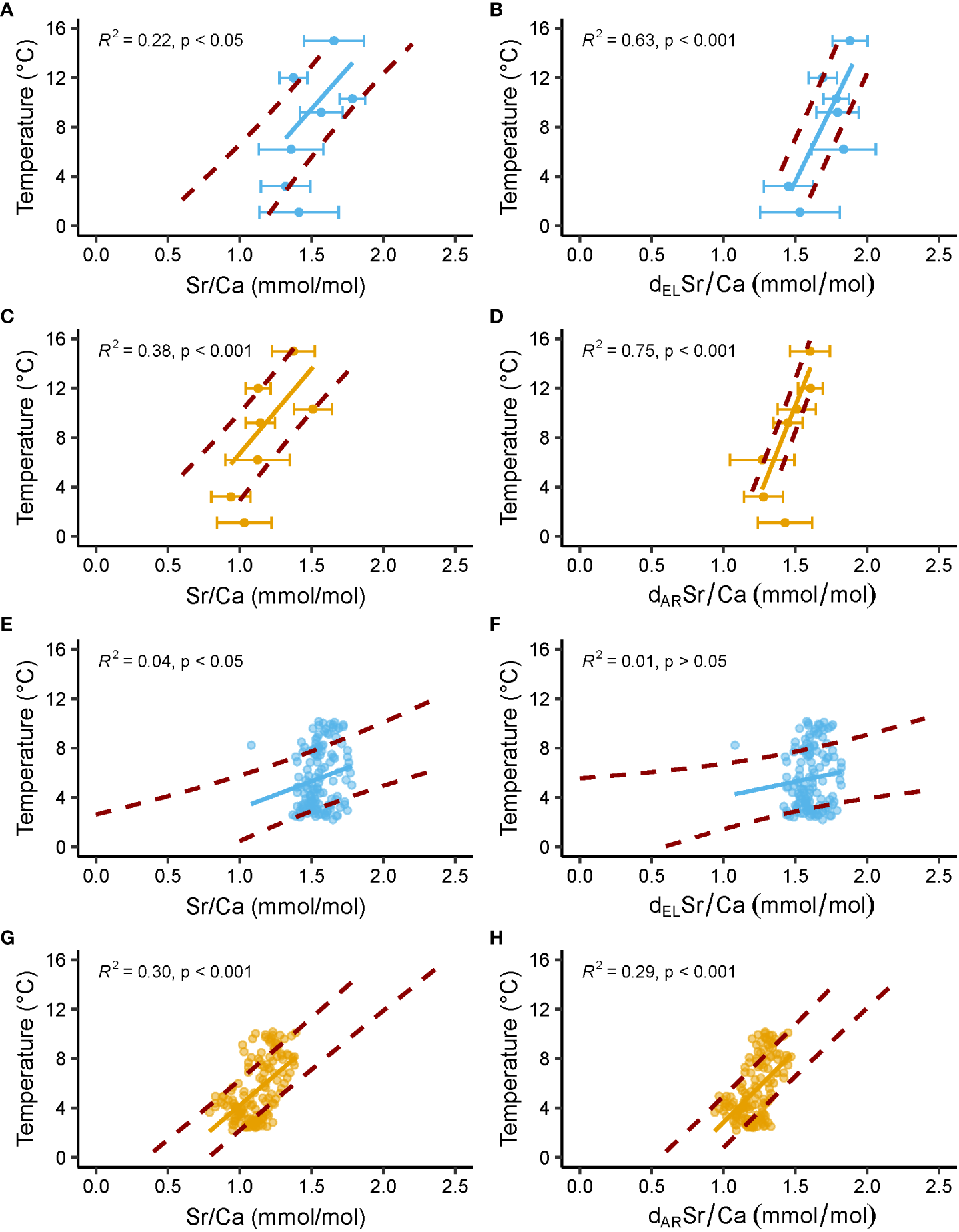 The regression curves were examined in the outer and inner portions of the outer shell layer (oOSL and iOSL, respectively) for undetrended Sr/Ca, as well as for Sr/Ca detrended (d) by GR, AR and EL, as well as combinations of GR and AR (GRAR), GR and EL (GREL), and GR, AR and EL (GRAREL). Natural logarithm models were applied for regressions between Sr/Ca and GR, AR and EL, whereas linear models were applied for relationships between Sr/Ca and T. For all regressions, ns, non-significant at p > 0.05.