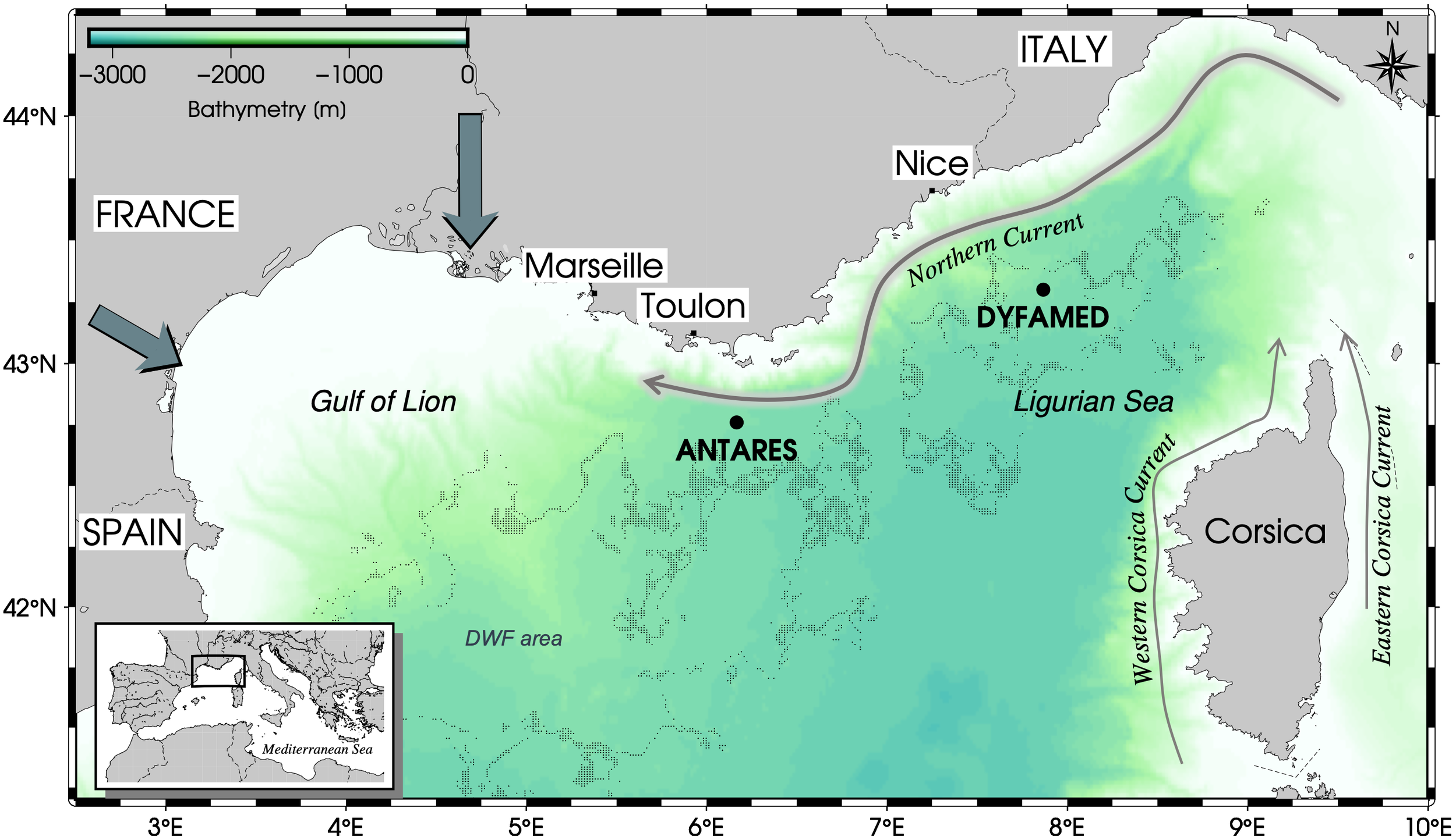 Following the DYFAMED initiative, the ANTARES (Astronomy with a Neutrino Telescope and Abyss environmental RESearch) time-series was initiated in 2009 [Lefèvre, 2010]. While being outside the deep convection area occurring in the GoL, the ANTARES site is located in a key zone for the NC dynamics at the entrance of the GoL shelf [Petrenko, 2003]. Moreover, numerous studies have reported the presence of submesoscale eddies in the NW Mediterranean Sea that can advect newly formed deep waters away from the Dense Water Formation (DWF) area [Bosse et al., 2016; Damien et al., 2017] and interact with the NC [Testor and Gascard, 2006]. The ANTARES and DYFAMED time-series are part of the French MOOSE program (Mediterranean Ocean Observing System for the Environment; https://www.moose-network.fr – Coppola et al. (2019)) that coordinate and maintain fixed long-term observations across Europe.