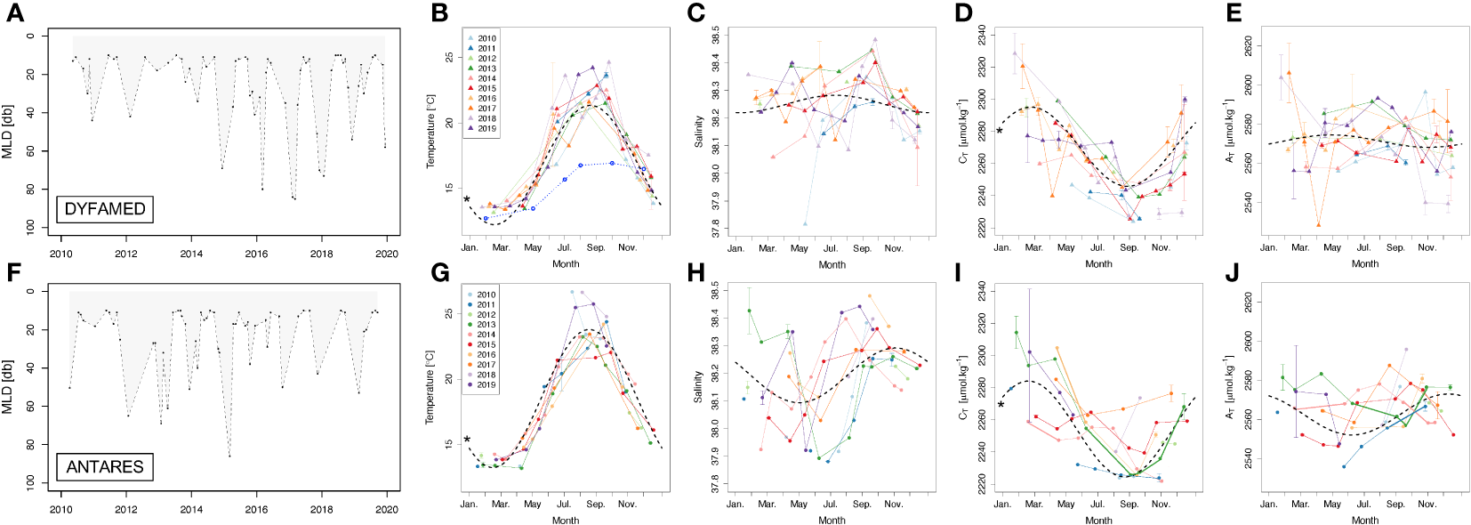 (A, F) Temporal variations of the mixed layer depth (MLD) from January 2010 to December 2019 at DYFAMED (A) and ANTARES (F). Interannual variability of temperature (B, G), salinity (C, G), total inorganic carbon [CT – (D, I), total alkalinity [AT – (E, J)] at DYFAMED (upper panel), ANTARES (lower panel). The colour code represents the year and is similar on panels (B-E, G-J). Average values with error bars showing the standard deviation of the mean values have been plotted when multiple data were recorded for the same date within the mixed layer. Dashed lines on panels (B-E, G-J) represent the harmonic fit for each parameter. Curves with a star are those where the fitting parameters (A, B) are significant. When no data have been acquired during three consecutive months, dots have not been joined. On (B), the blue line indicates mean temperature values over the first 40 meters depth during the reference situation of 1995.
